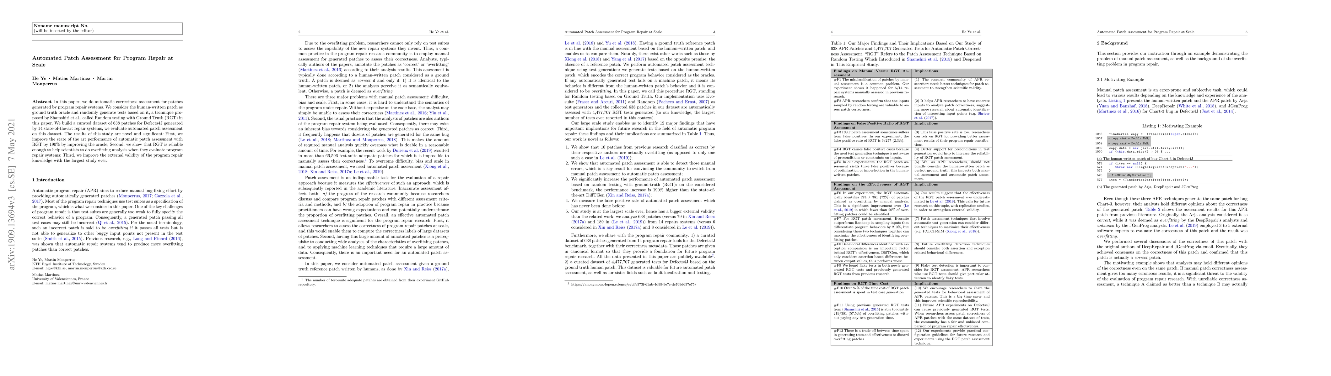 This paper introduces an automated method for assessing patches generated by program repair systems using Random testing with Ground Truth (RGT). The study significantly improves automatic patch assessment performance by 190% and demonstrates the reliability of RGT for overfitting analysis and enhancing the external validity of program repair research.