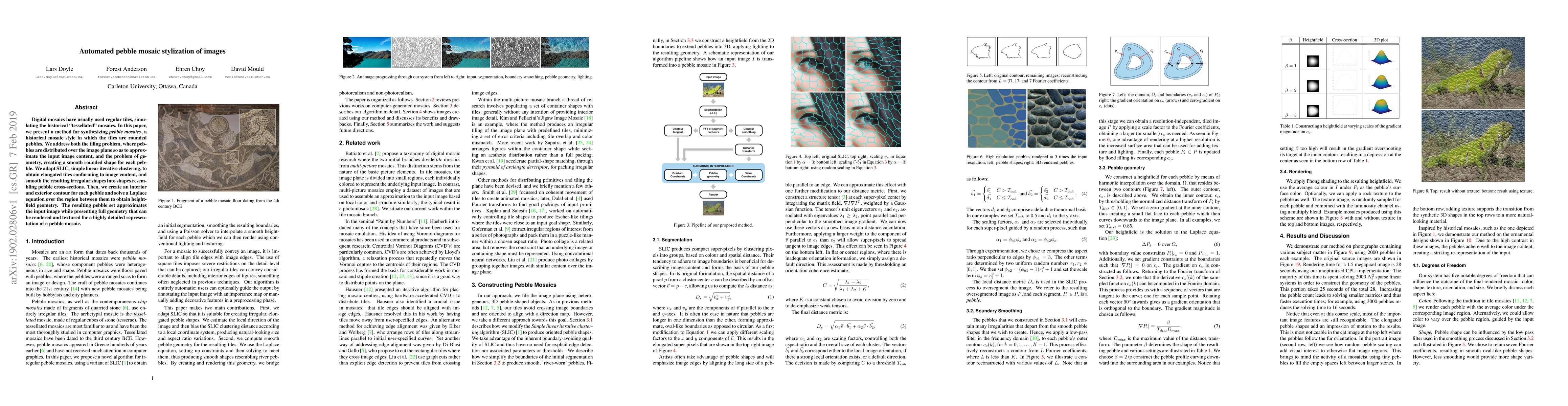 Digital mosaics have usually used regular tiles, simulating the historical "tessellated" mosaics. In this paper, we present a method for synthesizing pebble mosaics, a historical mosaic style in which the tiles are rounded pebbles. We address both the tiling problem, where pebbles are distributed over the image plane so as to approximate the input image content, and the problem of geometry, creating a smooth rounded shape for each pebble. We adapt SLIC, simple linear iterative clustering, to obtain elongated tiles conforming to image content, and smooth the resulting irregular shapes into shapes resembling pebble cross-sections. Then, we create an interior and exterior contour for each pebble and solve a Laplace equation over the region between them to obtain height-field geometry. The resulting pebble set approximates the input image while presenting full geometry that can be rendered and textured for a highly detailed representation of a pebble mosaic.