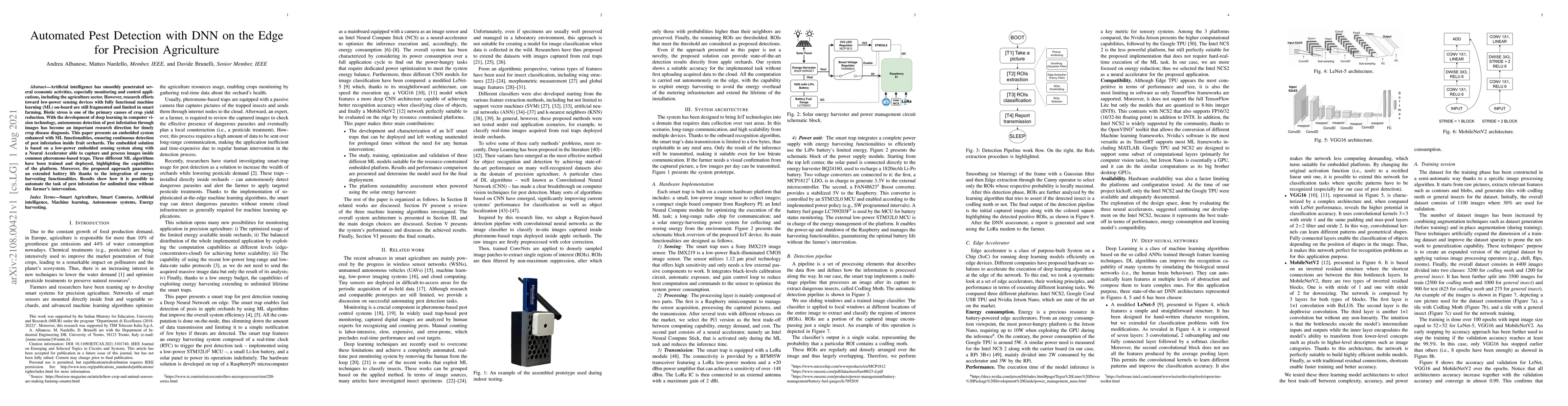 This paper introduces an embedded system for automated pest detection in fruit orchards using deep learning on-edge devices, enabling continuous monitoring with low power consumption and energy harvesting. The system employs neural accelerators to process images from pheromone traps, demonstrating the effectiveness of three different machine learning algorithms for pest detection.