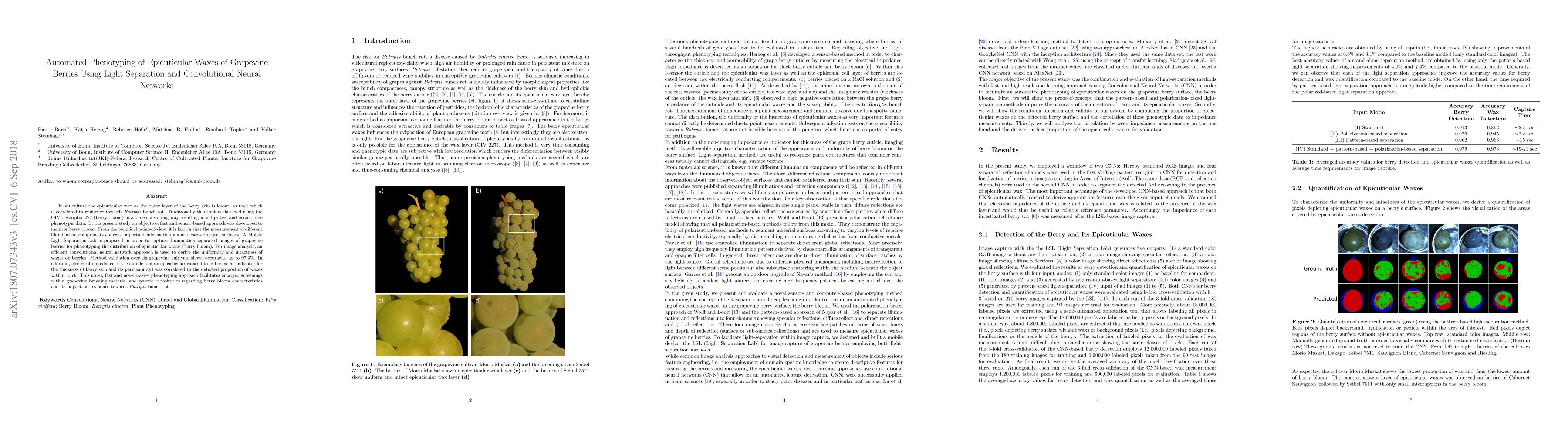 This paper presents an automated method using a Mobile Light-Separation-Lab and convolutional neural networks for objective phenotyping of grapevine berry epicuticular waxes, significantly improving accuracy and efficiency compared to traditional methods. The approach correlates wax distribution with berry resilience to Botrytis bunch rot, demonstrating high accuracy and potential for large-scale screening in grapevine breeding.