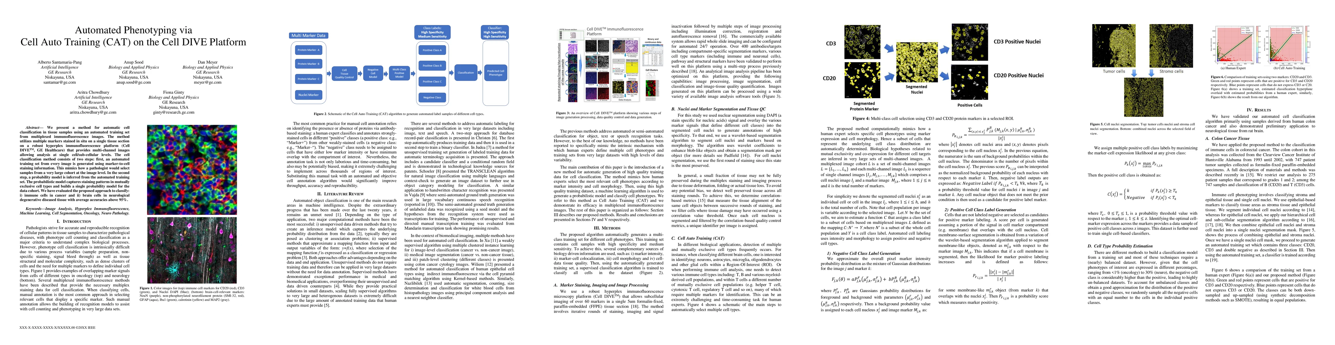 We present a method for automatic cell classification in tissue samples using an automated training set from multiplexed immunofluorescence images. The method utilizes multiple markers stained in situ on a single tissue section on a robust hyperplex immunofluorescence platform (Cell DIVE, GE Healthcare) that provides multi-channel images allowing analysis at single cell/sub-cellular levels. The cell classification method consists of two steps: first, an automated training set from every image is generated using marker-to-cell staining information. This mimics how a pathologist would select samples from a very large cohort at the image level. In the second step, a probability model is inferred from the automated training set. The probabilistic model captures staining patterns in mutually exclusive cell types and builds a single probability model for the data cohort. We have evaluated the proposed approach to classify: i) immune cells in cancer and ii) brain cells in neurological degenerative diseased tissue with average accuracies above 95%.