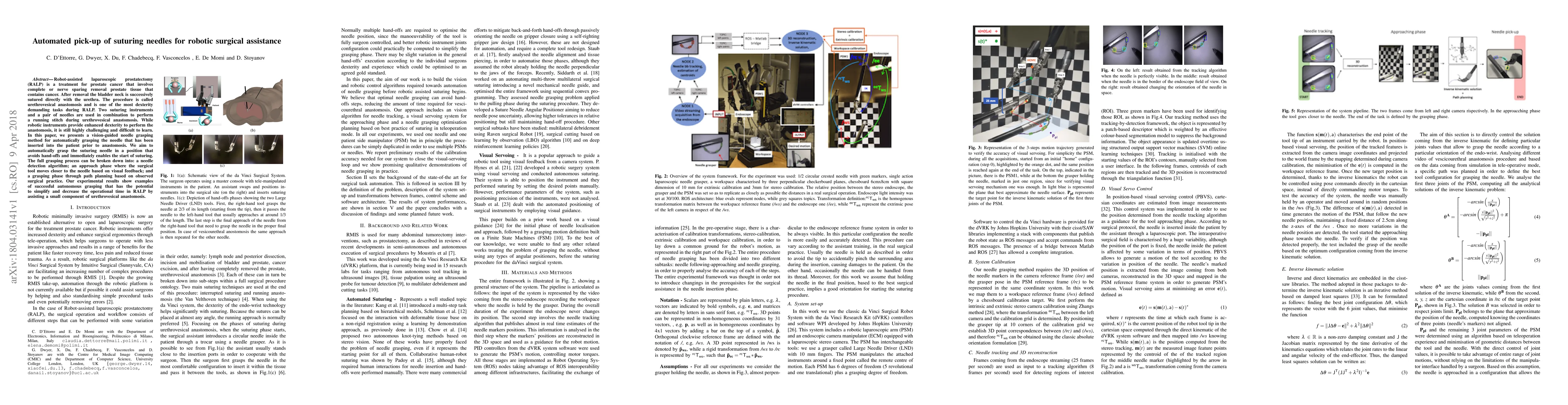 This paper presents a vision-guided method for robotically assisting in the pick-up of suturing needles during robot-assisted laparoscopic prostatectomy, aiming to reduce hand-offs and operational time. The method includes needle detection, approach, and grasping phases, demonstrating successful autonomous needle grasping in experiments.