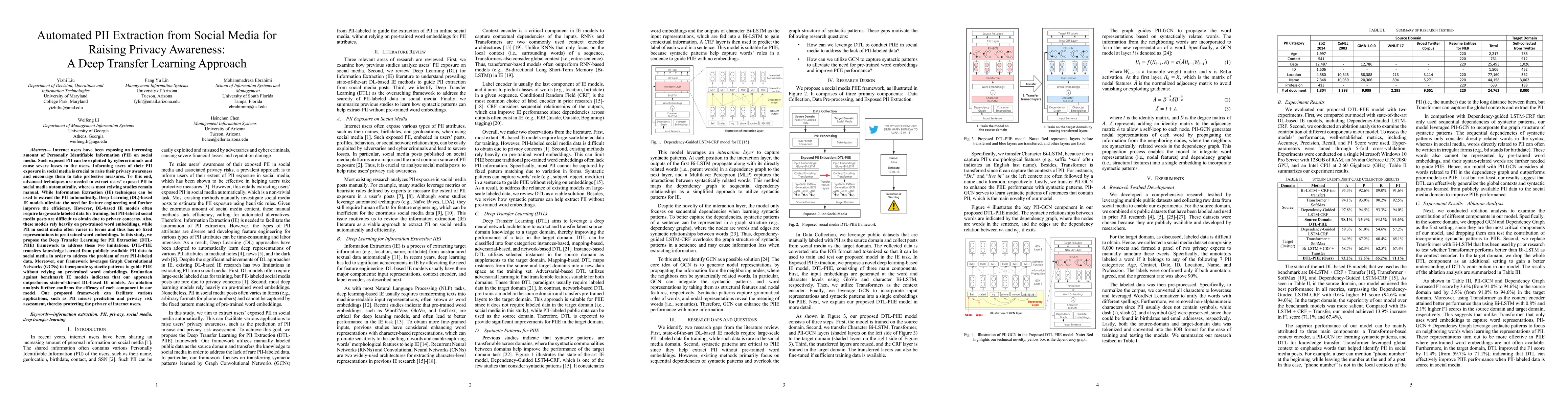 This paper proposes a Deep Transfer Learning for PII Extraction (DTL-PIIE) framework to automatically extract Personally Identifiable Information (PII) from social media, addressing the scarcity of labeled PII data and the variability of PII forms. The framework leverages Graph Convolutional Networks to enhance extraction without relying on pre-trained word embeddings, outperforming existing deep learning models in evaluations.