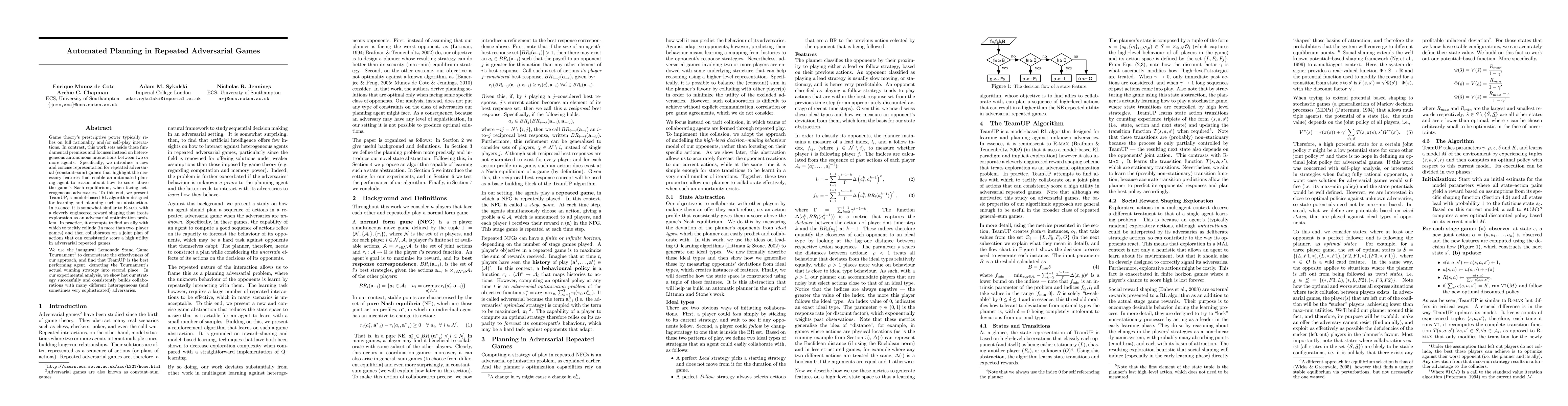 Game theory's prescriptive power typically relies on full rationality and/or self-play interactions. In contrast, this work sets aside these fundamental premises and focuses instead on heterogeneous autonomous interactions between two or more agents. Specifically, we introduce a new and concise representation for repeated adversarial (constant-sum) games that highlight the necessary features that enable an automated planing agent to reason about how to score above the game's Nash equilibrium, when facing heterogeneous adversaries. To this end, we present TeamUP, a model-based RL algorithm designed for learning and planning such an abstraction. In essence, it is somewhat similar to R-max with a cleverly engineered reward shaping that treats exploration as an adversarial optimization problem. In practice, it attempts to find an ally with which to tacitly collude (in more than two-player games) and then collaborates on a joint plan of actions that can consistently score a high utility in adversarial repeated games. We use the inaugural Lemonade Stand Game Tournament to demonstrate the effectiveness of our approach, and find that TeamUP is the best performing agent, demoting the Tournament's actual winning strategy into second place. In our experimental analysis, we show hat our strategy successfully and consistently builds collaborations with many different heterogeneous (and sometimes very sophisticated) adversaries.