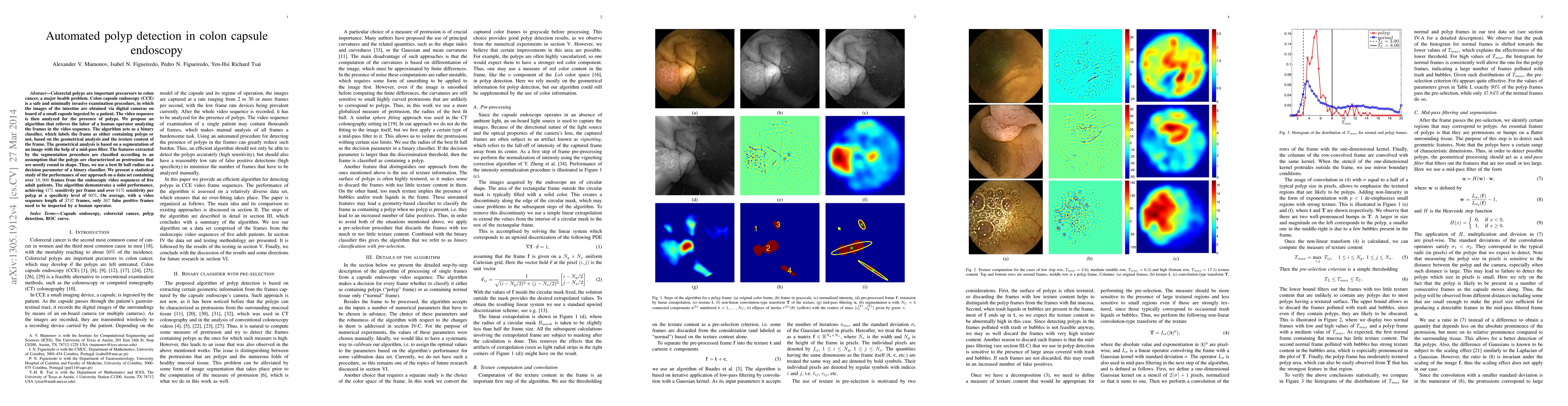 This paper proposes an automated algorithm for detecting colorectal polyps in colon capsule endoscopy videos, aiming to reduce the workload of human operators. The algorithm uses geometrical and texture analysis to classify video frames, achieving 47% sensitivity per frame and over 81% sensitivity per polyp at a 90% specificity level, significantly reducing the number of frames requiring human inspection.