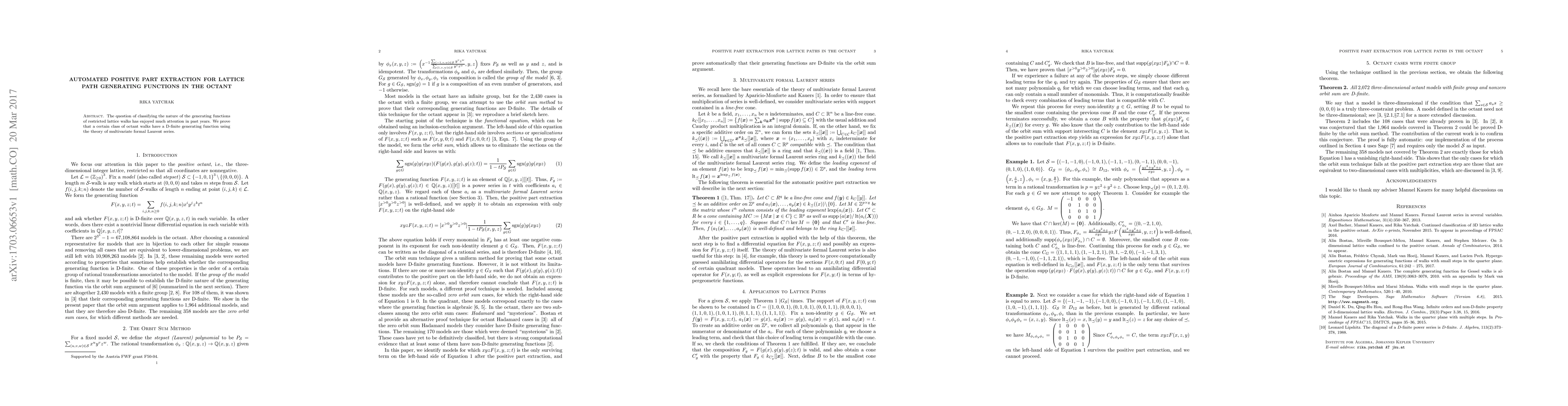 Researchers prove that a certain class of octant walks have D-finite generating functions, a key finding with implications for understanding restricted lattice walks.