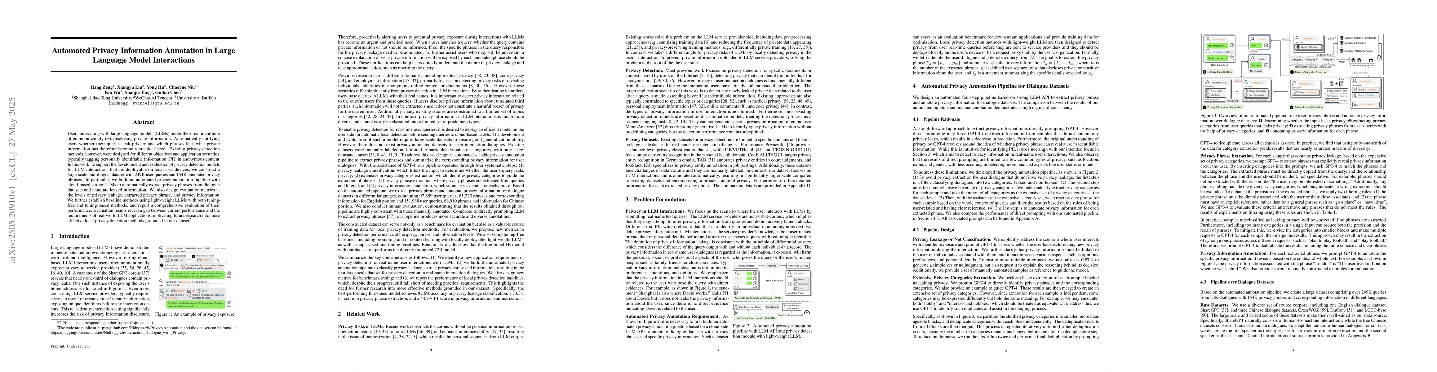 This work is novel in focusing on automated privacy information annotation specifically for large language model interactions, constructing a dataset and pipeline for local device deployment, and identifying the gap in current privacy detection methods for this application.