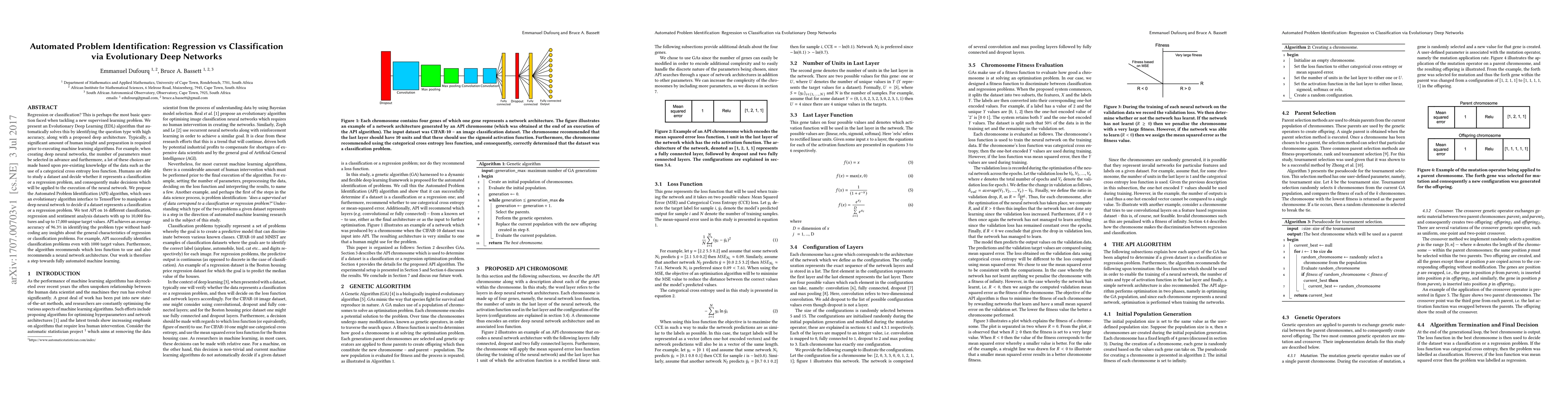 Regression or classification? This is perhaps the most basic question faced when tackling a new supervised learning problem. We present an Evolutionary Deep Learning (EDL) algorithm that automatically solves this by identifying the question type with high accuracy, along with a proposed deep architecture. Typically, a significant amount of human insight and preparation is required prior to executing machine learning algorithms. For example, when creating deep neural networks, the number of parameters must be selected in advance and furthermore, a lot of these choices are made based upon pre-existing knowledge of the data such as the use of a categorical cross entropy loss function. Humans are able to study a dataset and decide whether it represents a classification or a regression problem, and consequently make decisions which will be applied to the execution of the neural network. We propose the Automated Problem Identification (API) algorithm, which uses an evolutionary algorithm interface to TensorFlow to manipulate a deep neural network to decide if a dataset represents a classification or a regression problem. We test API on 16 different classification, regression and sentiment analysis datasets with up to 10,000 features and up to 17,000 unique target values. API achieves an average accuracy of $96.3\%$ in identifying the problem type without hardcoding any insights about the general characteristics of regression or classification problems. For example, API successfully identifies classification problems even with 1000 target values. Furthermore, the algorithm recommends which loss function to use and also recommends a neural network architecture. Our work is therefore a step towards fully automated machine learning.