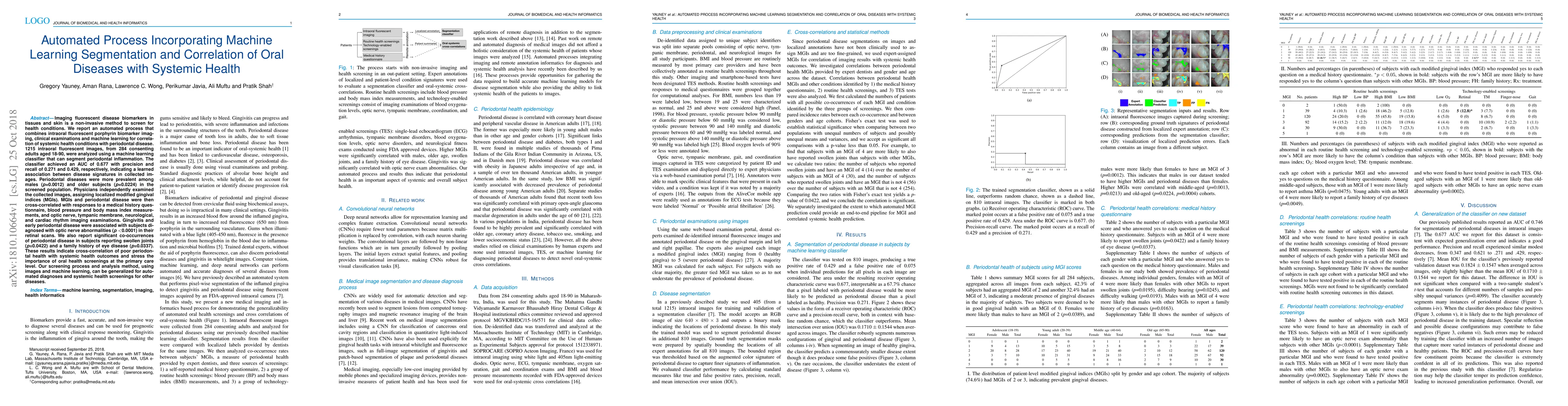 This study presents an automated process combining fluorescent biomarker imaging, clinical exams, and machine learning to correlate periodontal disease with systemic health conditions. The machine learning classifier achieved moderate accuracy in segmenting periodontal inflammation, revealing significant associations between periodontal disease and systemic health markers such as optic nerve abnormalities and joint swelling.