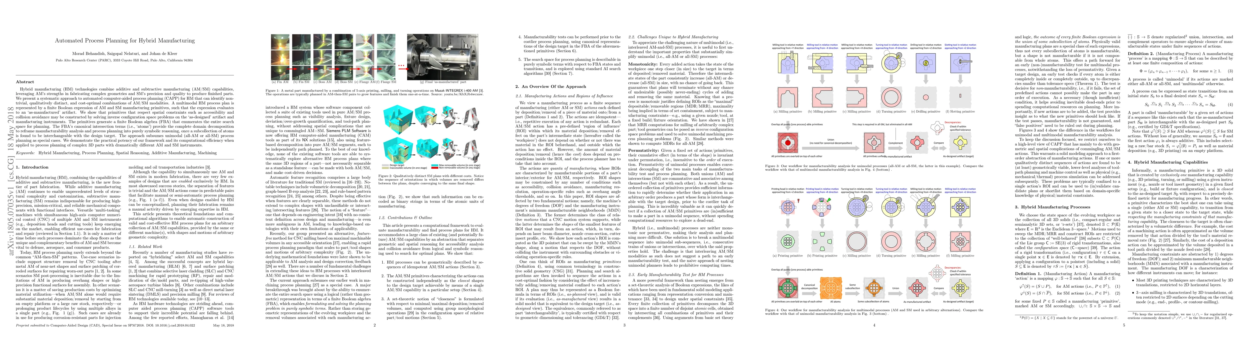 The research distinguishes itself by rethinking the representation of the as-designed specification in terms of manufacturing primitives, which allows for manufacturability evaluation prior to detailed process planning. It also presents a scalable approach to automatically construct HM process plans using symbolic manipulation and atomic decomposition.