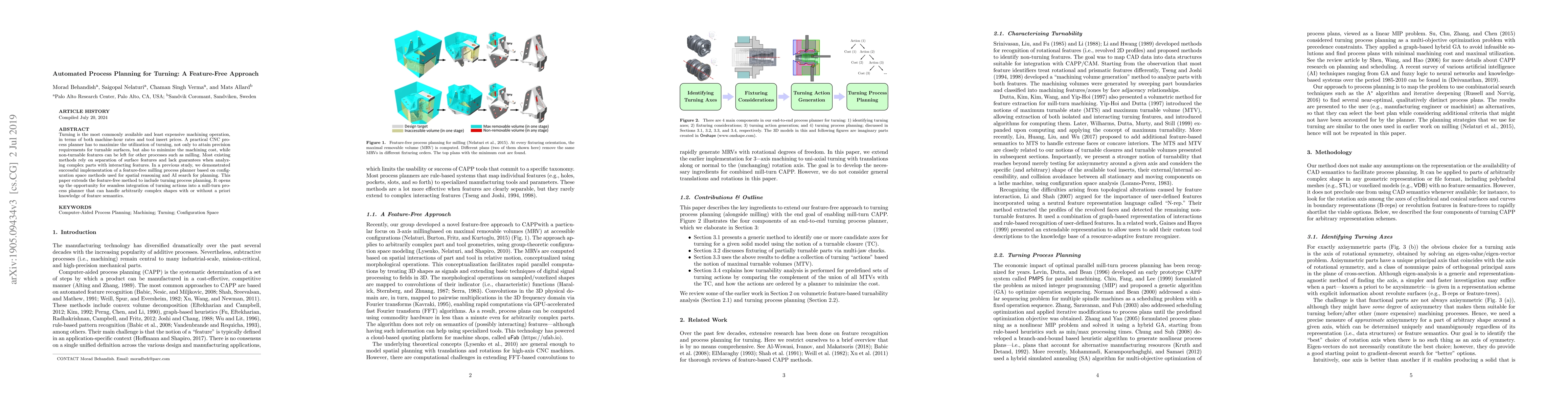 Turning is the most commonly available and least expensive machining operation, in terms of both machine-hour rates and tool insert prices. A practical CNC process planner has to maximize the utilization of turning, not only to attain precision requirements for turnable surfaces, but also to minimize the machining cost, while non-turnable features can be left for other processes such as milling. Most existing methods rely on separation of surface features and lack guarantees when analyzing complex parts with interacting features. In a previous study, we demonstrated successful implementation of a feature-free milling process planner based on configuration space methods used for spatial reasoning and AI search for planning. This paper extends the feature-free method to include turning process planning. It opens up the opportunity for seamless integration of turning actions into a mill-turn process planner that can handle arbitrarily complex shapes with or without a priori knowledge of feature semantics.