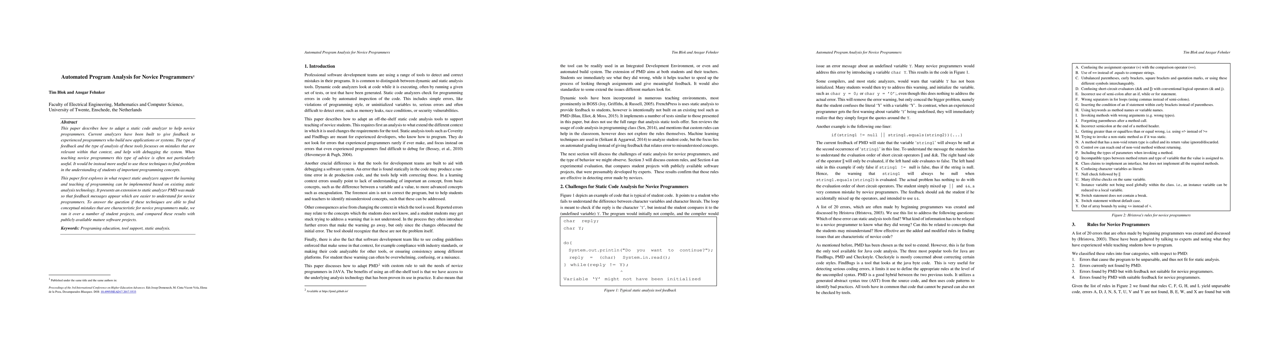 This paper adapts a static code analyzer to provide feedback for novice programmers, focusing on identifying conceptual errors rather than debugging experienced programmer's systems. An extension to PMD was developed to generate more comprehensible feedback, and its effectiveness was tested on student projects compared to mature software.