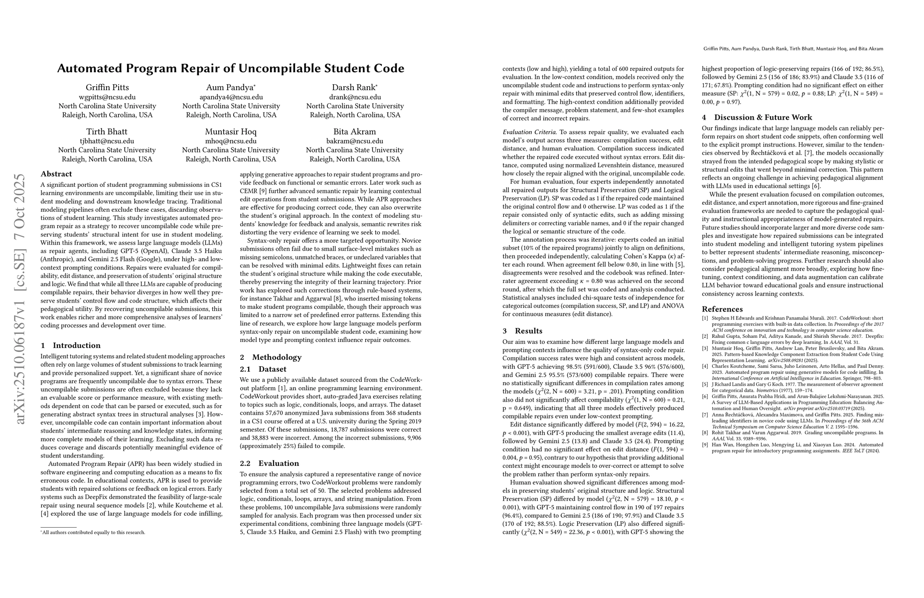 The study used a dataset of 57,670 anonymized Java submissions from a CS1 course, focusing on 100 uncompilable submissions. They evaluated three LLMs (GPT-5, Claude 3.5 Haiku, Gemini 2.5 Flash) under low and high-context prompting conditions, measuring compilability, edit distance, and structural/logical preservation through human evaluation.