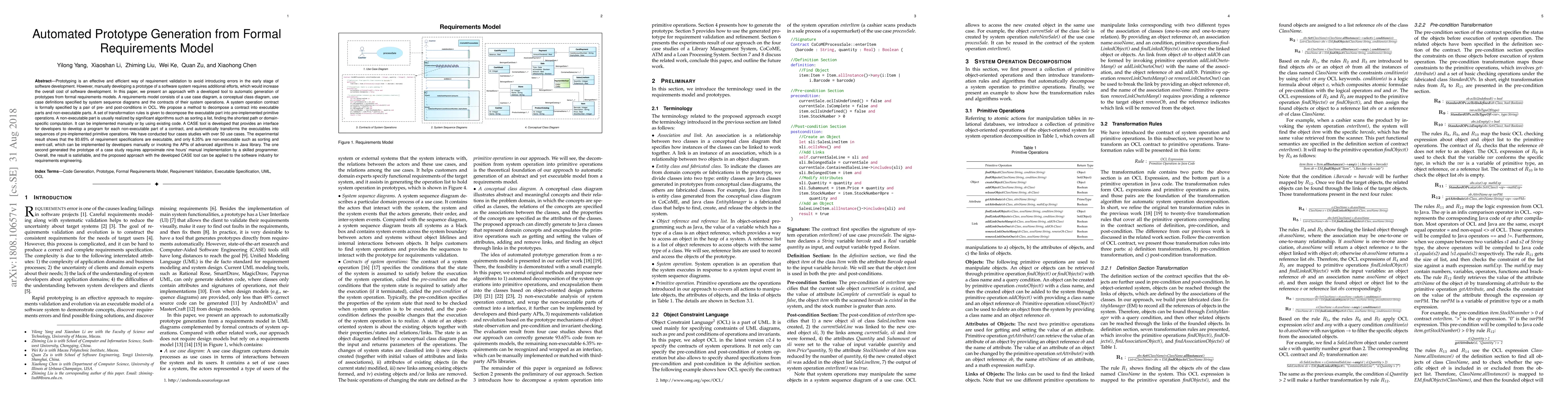 This paper presents an automated tool for generating software prototypes from formal requirements models, significantly reducing manual effort and cost. The tool decomposes contracts into executable and non-executable parts, transforming the former into primitive operations and allowing developers to implement the latter manually or via existing APIs. Experimental results show 93.65% of specifications are executable, validating the approach's efficiency.