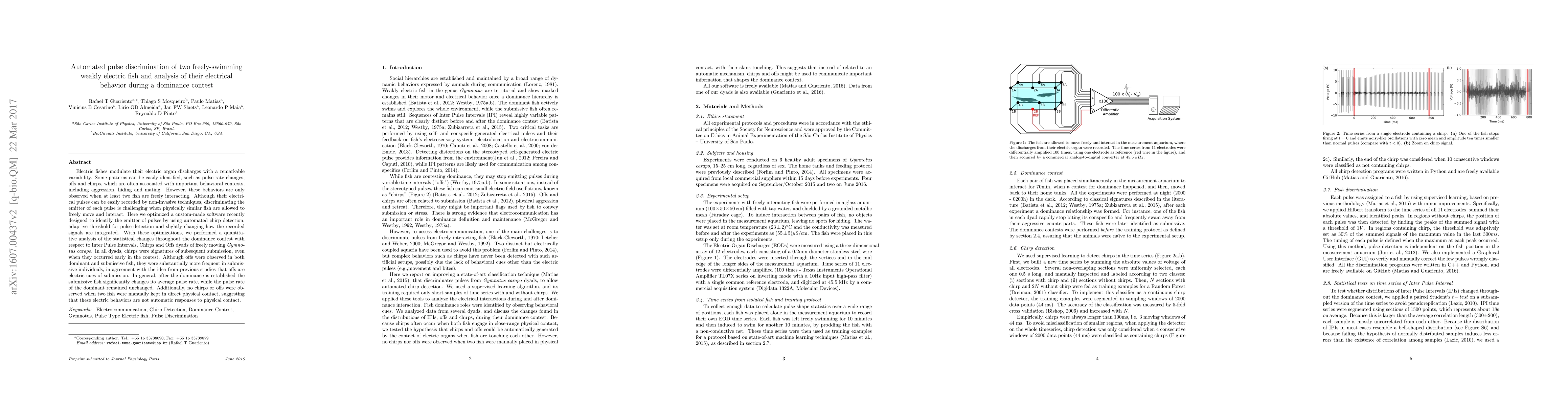 This study optimized software to identify electric fish pulse emitters, revealing that chirps signify submission and offs indicate submissive behavior in Gymnotus carapo. Dominant fish maintain pulse rate post-contest, while submissive ones change theirs. These behaviors aren't responses to physical contact.