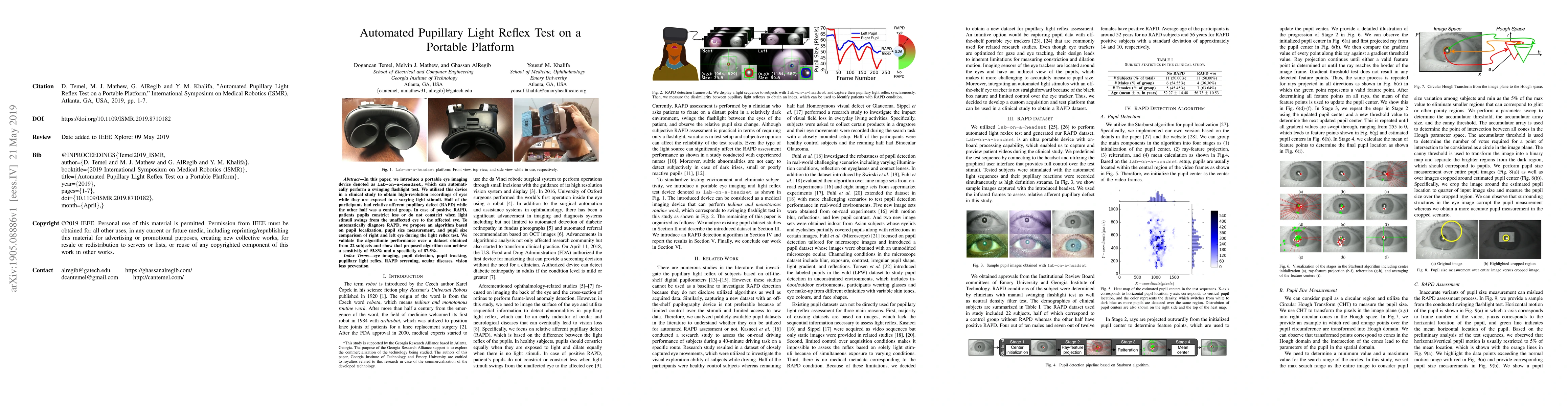 In this paper, we introduce a portable eye imaging device denoted as lab-on-a-headset, which can automatically perform a swinging flashlight test. We utilized this device in a clinical study to obtain high-resolution recordings of eyes while they are exposed to a varying light stimuli. Half of the participants had relative afferent pupillary defect (RAPD) while the other half was a control group. In case of positive RAPD, patients pupils constrict less or do not constrict when light stimuli swings from the unaffected eye to the affected eye. To automatically diagnose RAPD, we propose an algorithm based on pupil localization, pupil size measurement, and pupil size comparison of right and left eye during the light reflex test. We validate the algorithmic performance over a dataset obtained from 22 subjects and show that proposed algorithm can achieve a sensitivity of 93.8% and a specificity of 87.5%.