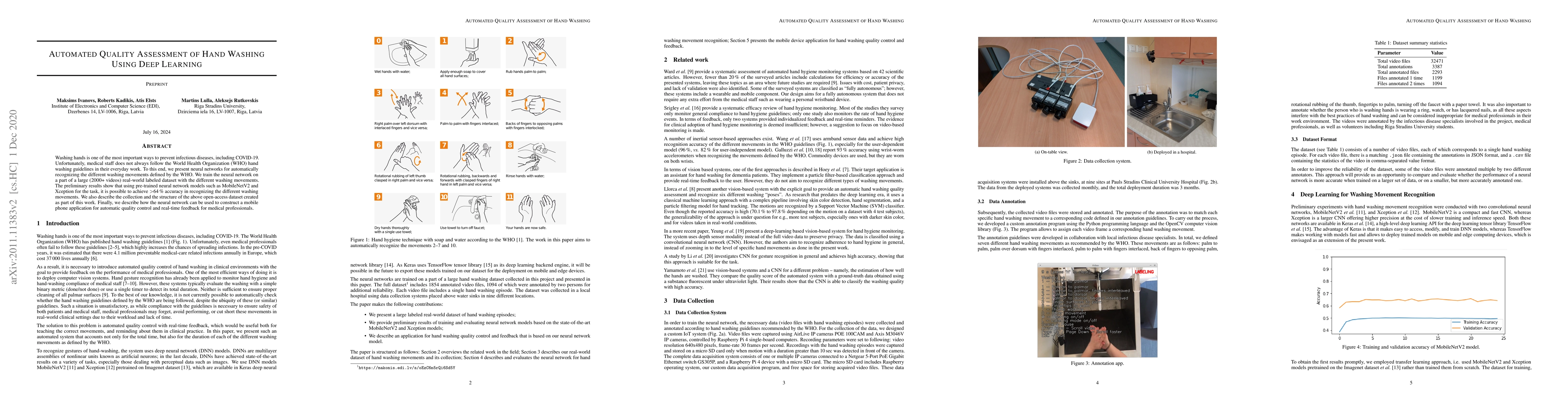 Washing hands is one of the most important ways to prevent infectious diseases, including COVID-19. Unfortunately, medical staff does not always follow the World Health Organization (WHO) hand washing guidelines in their everyday work. To this end, we present neural networks for automatically recognizing the different washing movements defined by the WHO. We train the neural network on a part of a large (2000+ videos) real-world labeled dataset with the different washing movements. The preliminary results show that using pre-trained neural network models such as MobileNetV2 and Xception for the task, it is possible to achieve >64 % accuracy in recognizing the different washing movements. We also describe the collection and the structure of the above open-access dataset created as part of this work. Finally, we describe how the neural network can be used to construct a mobile phone application for automatic quality control and real-time feedback for medical professionals.