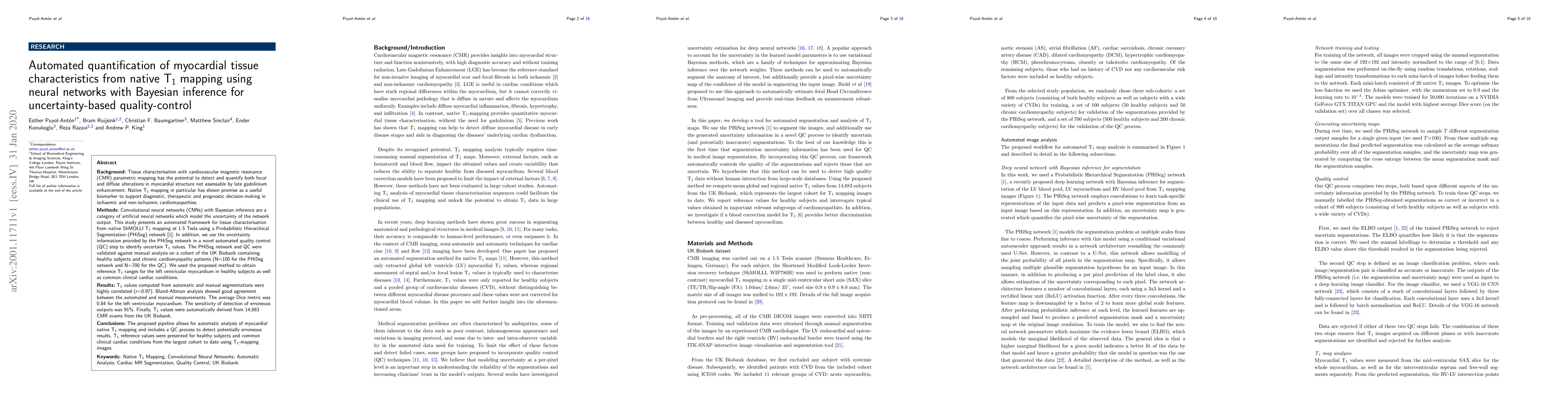This paper introduces an automated neural network framework using Bayesian inference for quantifying myocardial tissue characteristics from native T1 mapping in cardiac MRI. The Probabilistic Hierarchical Segmentation network, combined with uncertainty-based quality control, accurately detects myocardial tissue alterations and provides reference T1 ranges for healthy subjects and common cardiac conditions.