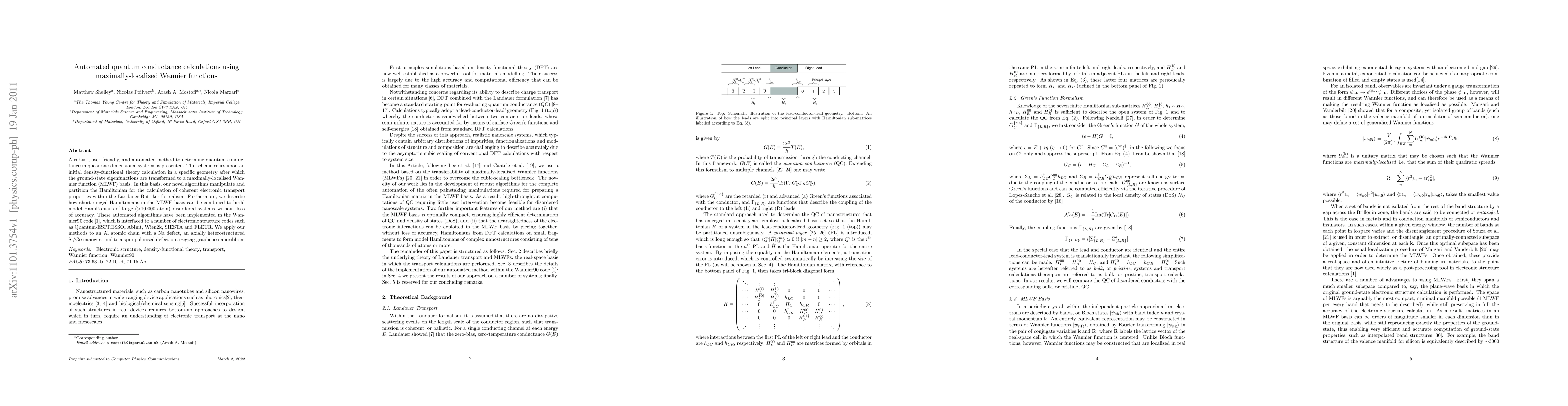 A robust, user-friendly, and automated method to determine quantum conductance in disordered quasi-one-dimensional systems is presented. The scheme relies upon an initial density- functional theory calculation in a specific geometry after which the ground-state eigenfunctions are transformed to a maximally-localised Wannier function (MLWF) basis. In this basis, our novel algorithms manipulate and partition the Hamiltonian for the calculation of coherent electronic transport properties within the Landauer-Buttiker formalism. Furthermore, we describe how short- ranged Hamiltonians in the MLWF basis can be combined to build model Hamiltonians of large (>10,000 atom) disordered systems without loss of accuracy. These automated algorithms have been implemented in the Wannier90 code[Mostofi et al, Comput. Phys. Commun. 178, 685 (2008)], which is interfaced to a number of electronic structure codes such as Quantum-ESPRESSO, AbInit, Wien2k, SIESTA and FLEUR. We apply our methods to an Al atomic chain with a Na defect, an axially heterostructured Si/Ge nanowire and to a spin-polarised defect on a zigzag graphene nanoribbon.