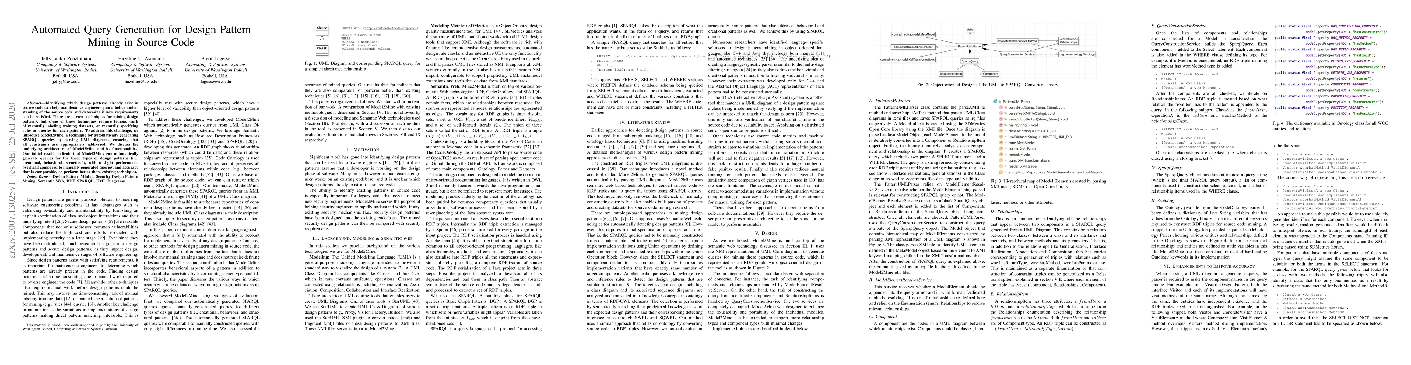 This research introduces Model2Mine, a method that automatically generates queries to identify design patterns in source code by analyzing UML diagrams, reducing manual effort. The approach shows promising accuracy across different pattern types, with only slight performance trade-offs compared to manual methods.