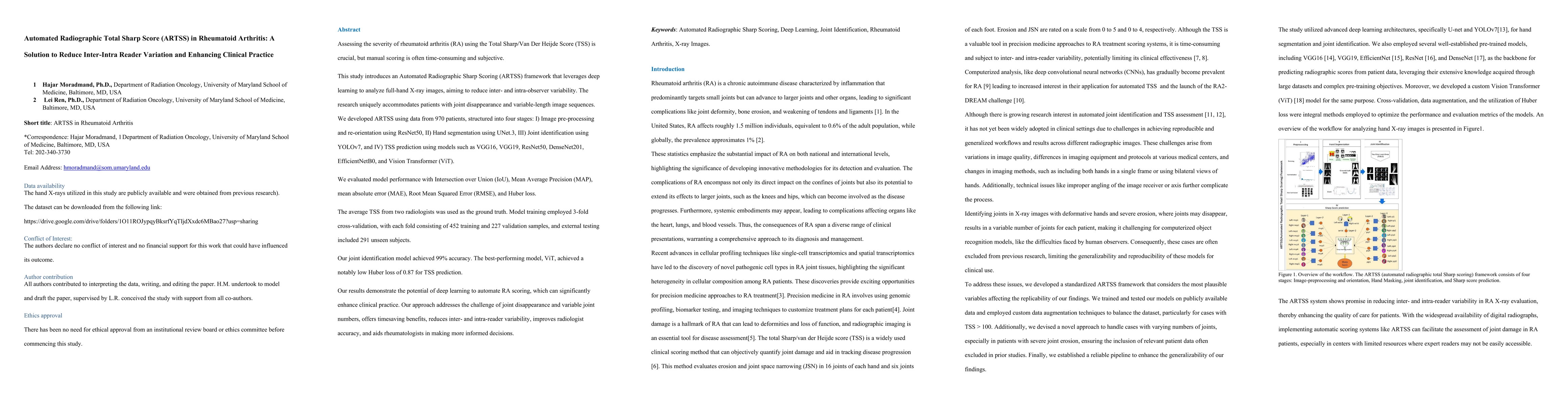 Assessing the severity of rheumatoid arthritis (RA) using the Total Sharp/Van Der Heijde Score (TSS) is crucial, but manual scoring is often time-consuming and subjective. This study introduces an Automated Radiographic Sharp Scoring (ARTSS) framework that leverages deep learning to analyze full-hand X-ray images, aiming to reduce inter- and intra-observer variability. The research uniquely accommodates patients with joint disappearance and variable-length image sequences. We developed ARTSS using data from 970 patients, structured into four stages: I) Image pre-processing and re-orientation using ResNet50, II) Hand segmentation using UNet.3, III) Joint identification using YOLOv7, and IV) TSS prediction using models such as VGG16, VGG19, ResNet50, DenseNet201, EfficientNetB0, and Vision Transformer (ViT). We evaluated model performance with Intersection over Union (IoU), Mean Average Precision (MAP), mean absolute error (MAE), Root Mean Squared Error (RMSE), and Huber loss. The average TSS from two radiologists was used as the ground truth. Model training employed 3-fold cross-validation, with each fold consisting of 452 training and 227 validation samples, and external testing included 291 unseen subjects. Our joint identification model achieved 99% accuracy. The best-performing model, ViT, achieved a notably low Huber loss of 0.87 for TSS prediction. Our results demonstrate the potential of deep learning to automate RA scoring, which can significantly enhance clinical practice. Our approach addresses the challenge of joint disappearance and variable joint numbers, offers timesaving benefits, reduces inter- and intra-reader variability, improves radiologist accuracy, and aids rheumatologists in making more informed decisions.