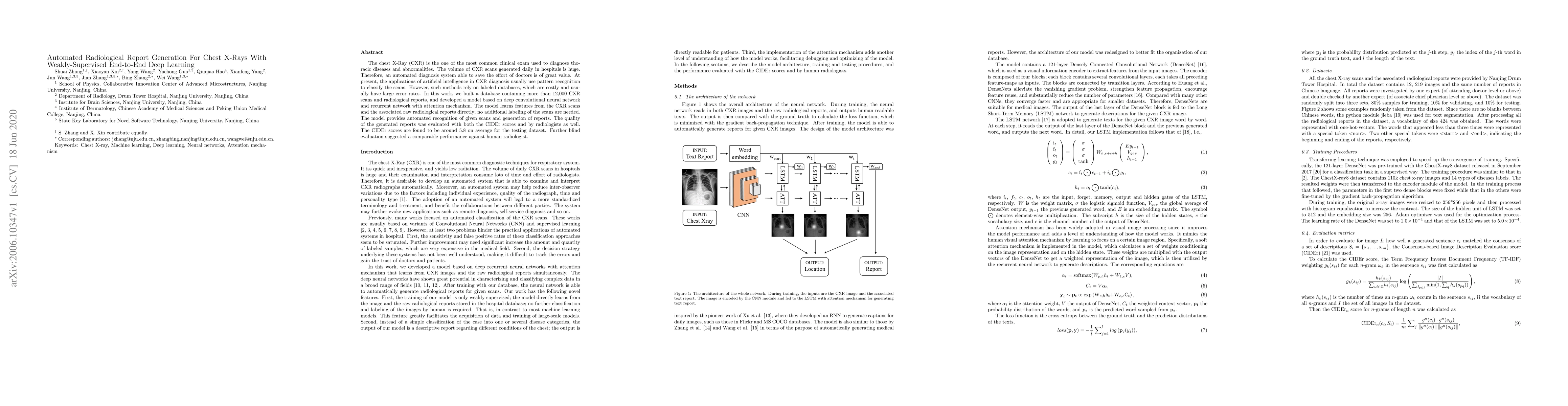 This paper presents an automated system for generating radiological reports from chest X-rays using a weakly-supervised deep learning model that combines convolutional and recurrent networks. The model achieves high-quality report generation without requiring labeled datasets, demonstrating comparable performance to human radiologists.