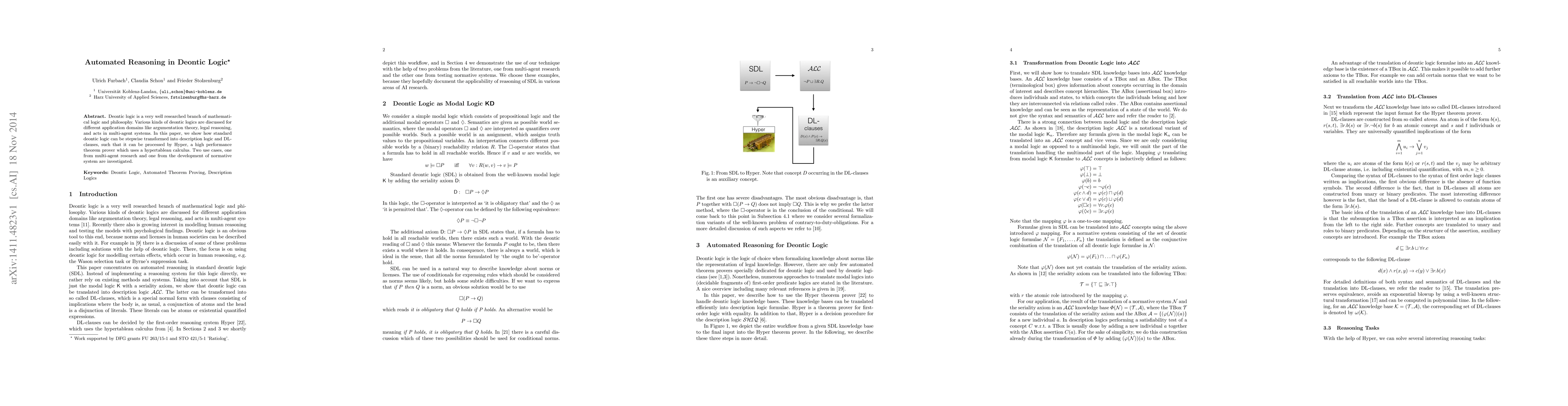 Deontic logic is a very well researched branch of mathematical logic and philosophy. Various kinds of deontic logics are discussed for different application domains like argumentation theory, legal reasoning, and acts in multi-agent systems. In this paper, we show how standard deontic logic can be stepwise transformed into description logic and DL- clauses, such that it can be processed by Hyper, a high performance theorem prover which uses a hypertableau calculus. Two use cases, one from multi-agent research and one from the development of normative system are investigated.