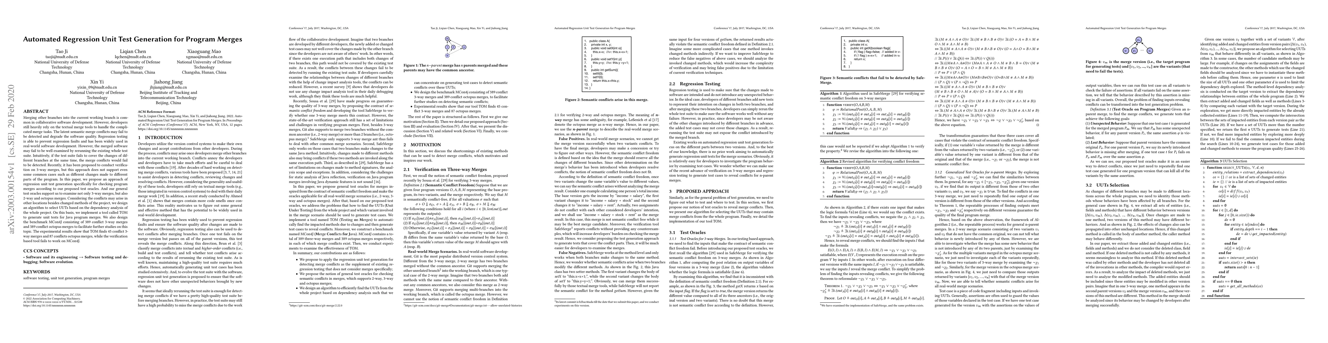 This paper proposes an automated approach for generating regression unit tests to detect conflicts in program merges, including 3-way, 2-way, and octopus merges. The tool TOM, implemented based on the proposed algorithm, successfully identifies conflicts in merges that traditional verification tools fail to detect, as demonstrated by the experimental results on the MCon4J benchmark.