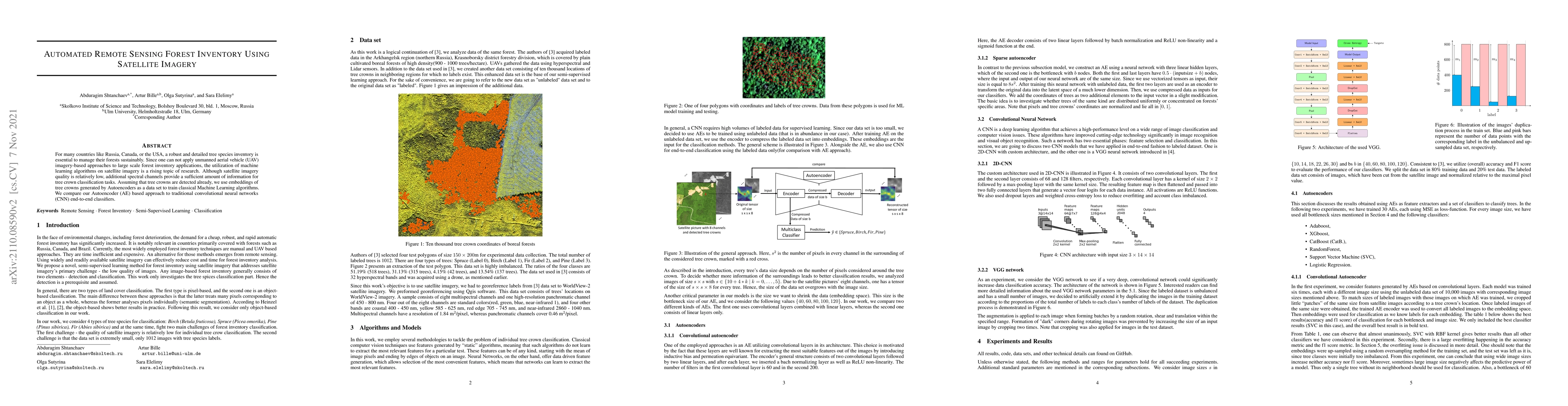 This paper explores the use of machine learning algorithms on satellite imagery for large-scale forest inventory, comparing Autoencoder-based embeddings to traditional CNN classifiers for tree crown classification, despite the relatively low quality of satellite imagery. The study finds that additional spectral channels provide sufficient data for effective tree species identification.