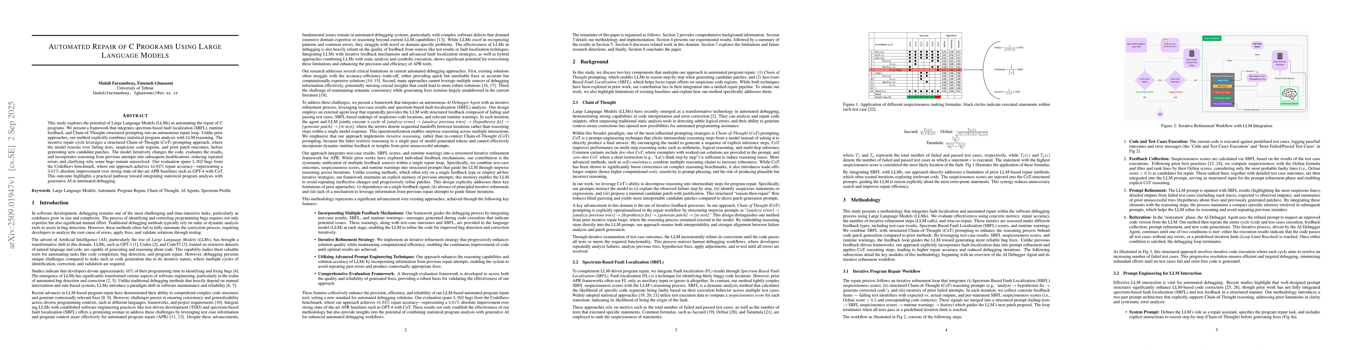 This study explores the potential of Large Language Models (LLMs) in automating the repair of C programs. We present a framework that integrates spectrum-based fault localization (SBFL), runtime feedback, and Chain-of-Thought-structured prompting into an autonomous repair loop. Unlike prior approaches, our method explicitly combines statistical program analysis with LLM reasoning. The iterative repair cycle leverages a structured Chain-of-Thought (CoT) prompting approach, where the model reasons over failing tests, suspicious code regions, and prior patch outcomes, before generating new candidate patches. The model iteratively changes the code, evaluates the results, and incorporates reasoning from previous attempts into subsequent modifications, reducing repeated errors and clarifying why some bugs remain unresolved. Our evaluation spans 3,902 bugs from the Codeflaws benchmark, where our approach achieves 44.93% repair accuracy, representing a 3.61% absolute improvement over strong state-of-the-art APR baselines such as GPT-4 with CoT. This outcome highlights a practical pathway toward integrating statistical program analysis with generative AI in automated debugging.