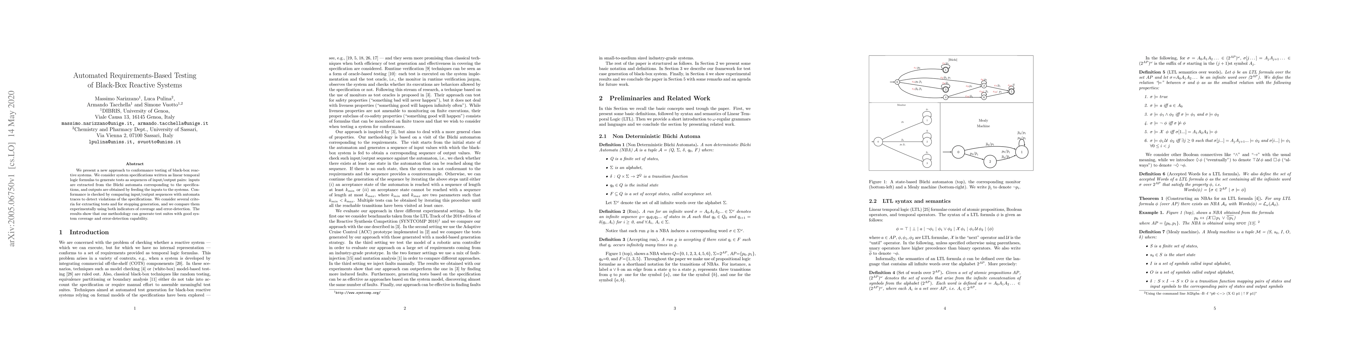 A new approach to testing black-box reactive systems is proposed, generating tests based on system specifications written in linear temporal logic, with promising results for coverage and error-detection capabilities.