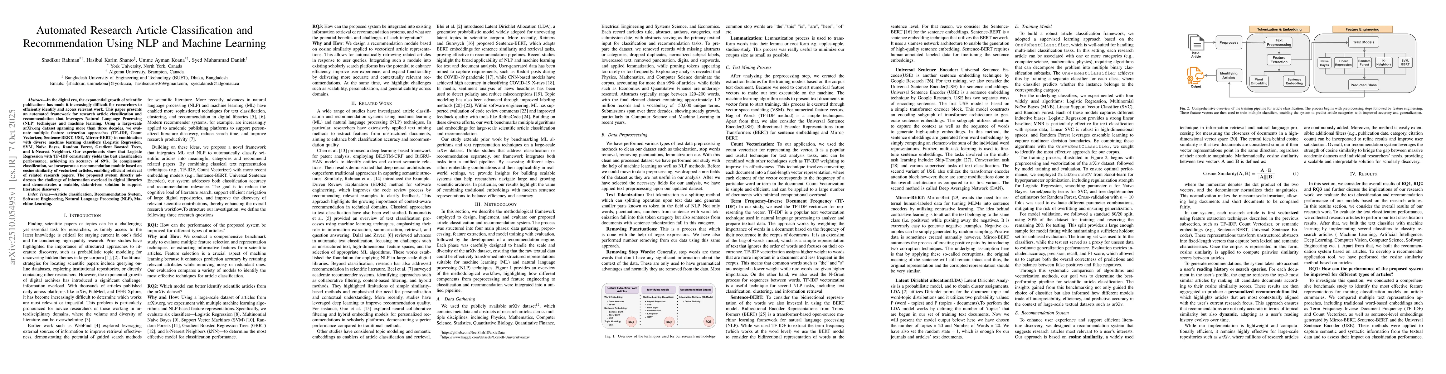 In the digital era, the exponential growth of scientific publications has made it increasingly difficult for researchers to efficiently identify and access relevant work. This paper presents an automated framework for research article classification and recommendation that leverages Natural Language Processing (NLP) techniques and machine learning. Using a large-scale arXiv.org dataset spanning more than three decades, we evaluate multiple feature extraction approaches (TF--IDF, Count Vectorizer, Sentence-BERT, USE, Mirror-BERT) in combination with diverse machine learning classifiers (Logistic Regression, SVM, Na\"ive Bayes, Random Forest, Gradient Boosted Trees, and k-Nearest Neighbour). Our experiments show that Logistic Regression with TF--IDF consistently yields the best classification performance, achieving an accuracy of 69\%. To complement classification, we incorporate a recommendation module based on the cosine similarity of vectorized articles, enabling efficient retrieval of related research papers. The proposed system directly addresses the challenge of information overload in digital libraries and demonstrates a scalable, data-driven solution to support literature discovery.