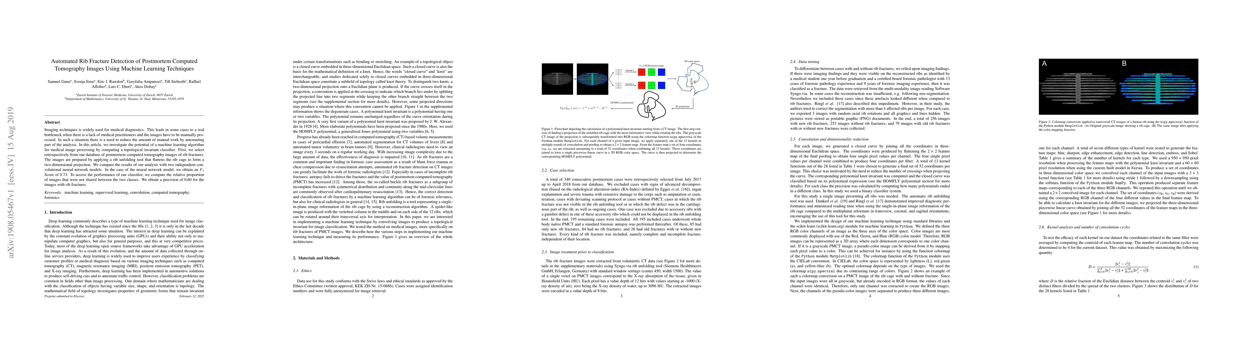Imaging techniques is widely used for medical diagnostics. This leads in some cases to a real bottleneck when there is a lack of medical practitioners and the images have to be manually processed. In such a situation there is a need to reduce the amount of manual work by automating part of the analysis. In this article, we investigate the potential of a machine learning algorithm for medical image processing by computing a topological invariant classifier. First, we select retrospectively from our database of postmortem computed tomography images of rib fractures. The images are prepared by applying a rib unfolding tool that flattens the rib cage to form a two-dimensional projection. We compare the results of our analysis with two independent convolutional neural network models. In the case of the neural network model, we obtain an $F_1$ Score of 0.73. To access the performance of our classifier, we compute the relative proportion of images that were not shared between the two classes. We obtain a precision of 0.60 for the images with rib fractures.
