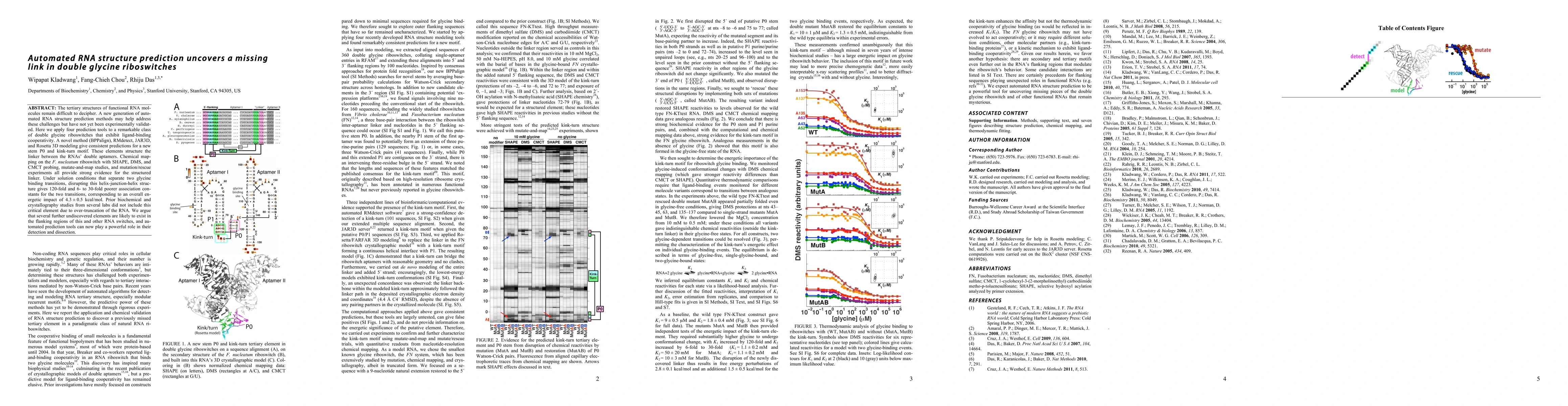This paper uses automated RNA structure prediction tools to identify a previously overlooked stem P0 and kink-turn motif in double glycine riboswitches, which structures the linker between the RNA's double aptamers. Experimental validation through chemical probing and mutation studies confirms the predictions, revealing a significant energetic impact on ligand binding.