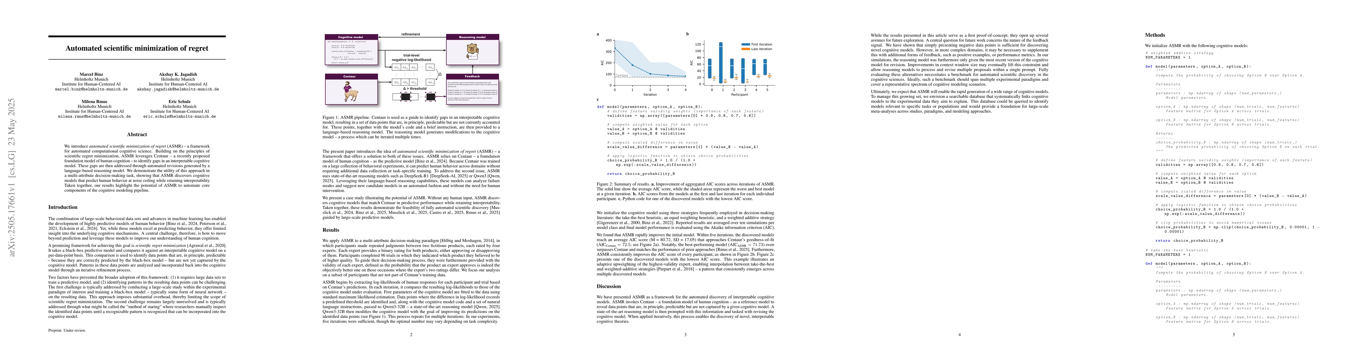 The paper introduces ASMR, a framework that combines scientific regret minimization principles with Centaur, a human cognition foundation model, to automate cognitive model refinement using language-based reasoning.