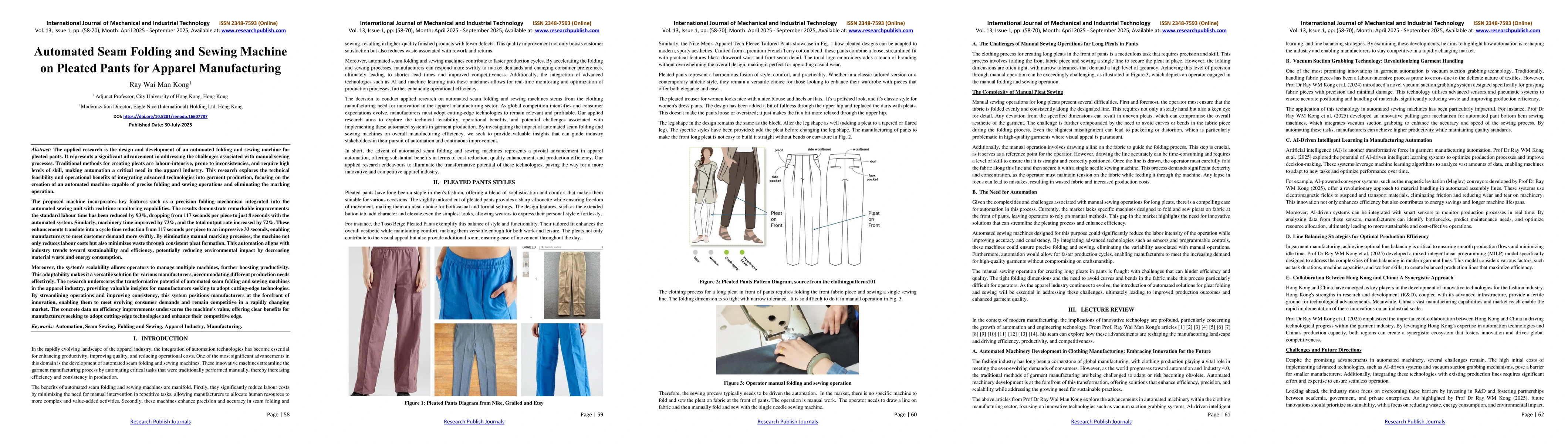 The applied research is the design and development of an automated folding and sewing machine for pleated pants. It represents a significant advancement in addressing the challenges associated with manual sewing processes. Traditional methods for creating pleats are labour-intensive, prone to inconsistencies, and require high levels of skill, making automation a critical need in the apparel industry. This research explores the technical feasibility and operational benefits of integrating advanced technologies into garment production, focusing on the creation of an automated machine capable of precise folding and sewing operations and eliminating the marking operation. The proposed machine incorporates key features such as a precision folding mechanism integrated into the automated sewing unit with real-time monitoring capabilities. The results demonstrate remarkable improvements: the standard labour time has been reduced by 93%, dropping from 117 seconds per piece to just 8 seconds with the automated system. Similarly, machinery time improved by 73%, and the total output rate increased by 72%. These enhancements translate into a cycle time reduction from 117 seconds per piece to an impressive 33 seconds, enabling manufacturers to meet customer demand more swiftly. By eliminating manual marking processes, the machine not only reduces labour costs but also minimizes waste through consistent pleat formation. This automation aligns with industry trends toward sustainability and efficiency, potentially reducing environmental impact by decreasing material waste and energy consumption.