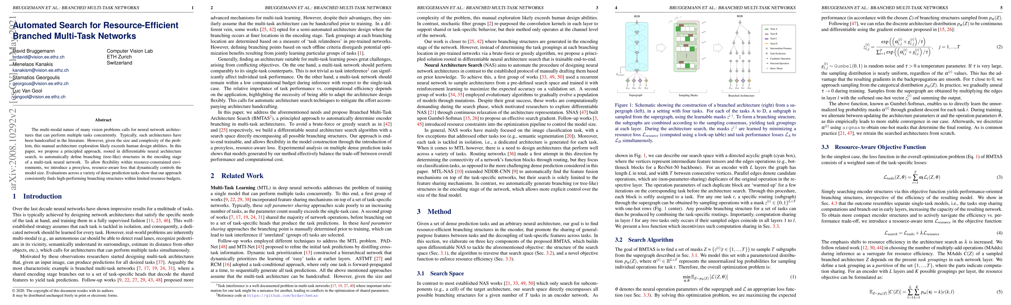 The multi-modal nature of many vision problems calls for neural network architectures that can perform multiple tasks concurrently. Typically, such architectures have been handcrafted in the literature. However, given the size and complexity of the problem, this manual architecture exploration likely exceeds human design abilities. In this paper, we propose a principled approach, rooted in differentiable neural architecture search, to automatically define branching (tree-like) structures in the encoding stage of a multi-task neural network. To allow flexibility within resource-constrained environments, we introduce a proxyless, resource-aware loss that dynamically controls the model size. Evaluations across a variety of dense prediction tasks show that our approach consistently finds high-performing branching structures within limited resource budgets.