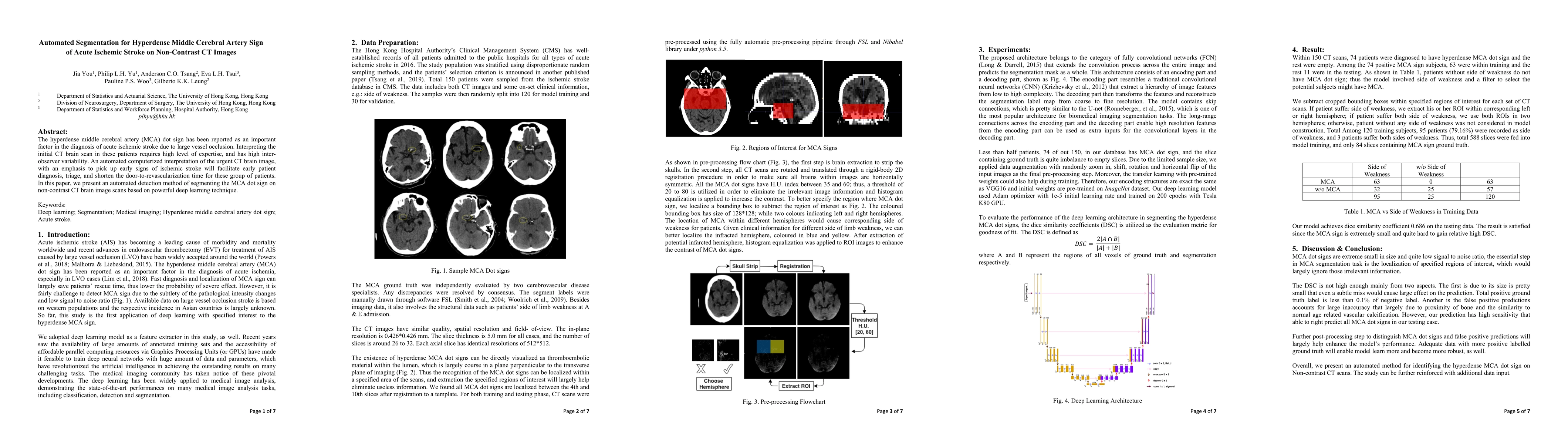 This paper introduces an automated deep learning method for segmenting the hyperdense middle cerebral artery dot sign on non-contrast CT images to aid in the early diagnosis of acute ischemic stroke, aiming to reduce inter-observer variability and expedite patient treatment.
