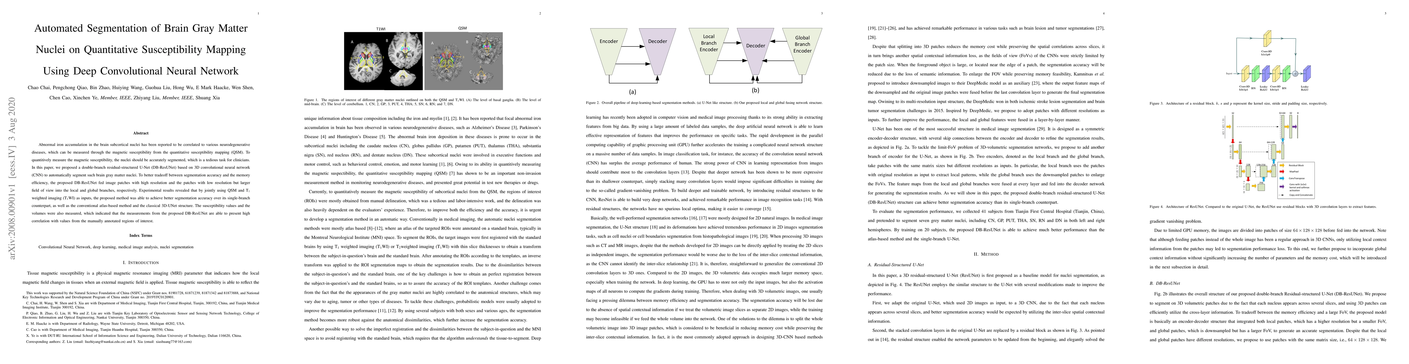 This paper proposes a double-branch residual-structured U-Net (DB-ResUNet) based on 3D CNN for automated segmentation of brain gray matter nuclei on quantitative susceptibility mapping (QSM). The method combines high-resolution and low-resolution image patches to improve accuracy and efficiency, achieving better segmentation results compared to single-branch and conventional methods.
