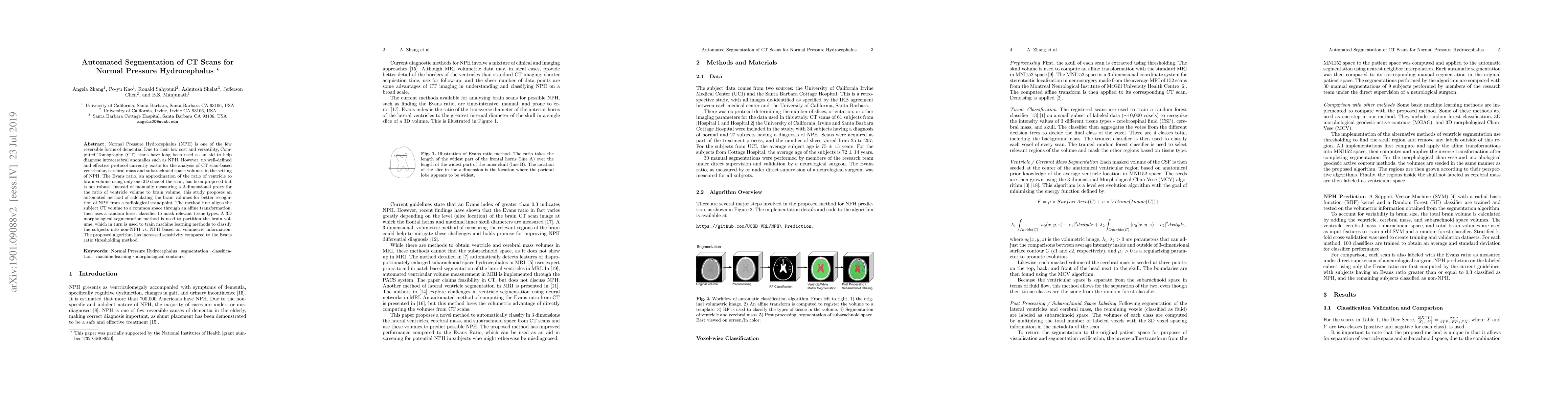 Normal Pressure Hydrocephalus (NPH) is one of the few reversible forms of dementia, Due to their low cost and versatility, Computed Tomography (CT) scans have long been used as an aid to help diagnose intracerebral anomalies such as NPH. However, no well-defined and effective protocol currently exists for the analysis of CT scan-based ventricular, cerebral mass and subarachnoid space volumes in the setting of NPH. The Evan's ratio, an approximation of the ratio of ventricle to brain volume using only one 2D slice of the scan, has been proposed but is not robust. Instead of manually measuring a 2-dimensional proxy for the ratio of ventricle volume to brain volume, this study proposes an automated method of calculating the brain volumes for better recognition of NPH from a radiological standpoint. The method first aligns the subject CT volume to a common space through an affine transformation, then uses a random forest classifier to mask relevant tissue types. A 3D morphological segmentation method is used to partition the brain volume, which in turn is used to train machine learning methods to classify the subjects into non-NPH vs. NPH based on volumetric information. The proposed algorithm has increased sensitivity compared to the Evan's ratio thresholding method.