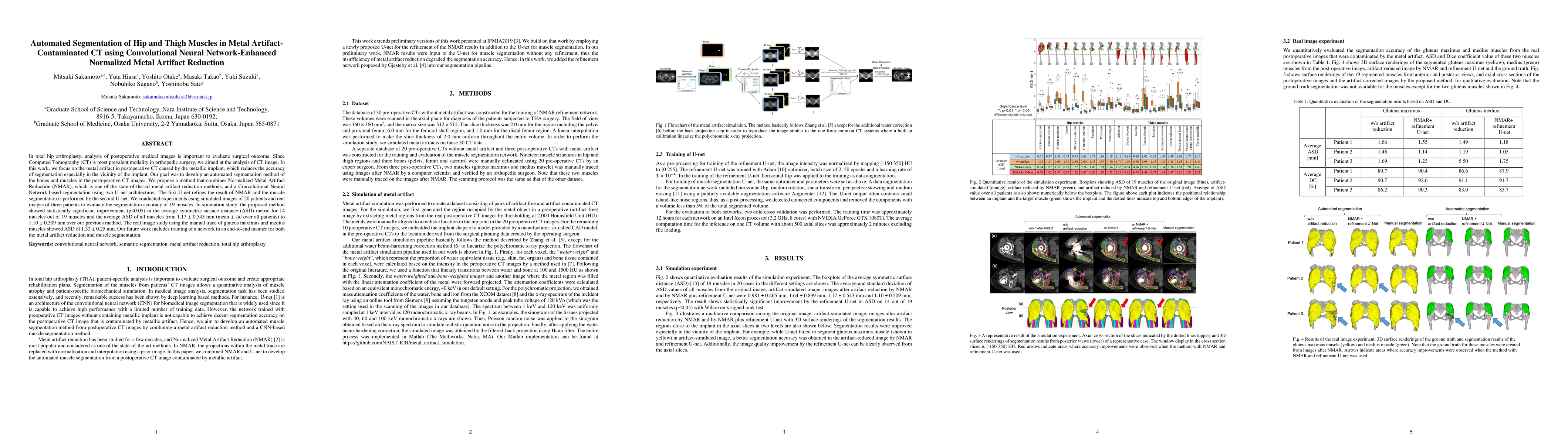 This paper proposes an automated segmentation method for hip and thigh muscles in metal artifact-contaminated CT images using a combination of Normalized Metal Artifact Reduction and Convolutional Neural Networks. The method shows significant improvement in segmentation accuracy, especially around metallic implants, as demonstrated by both simulated and real patient data.
