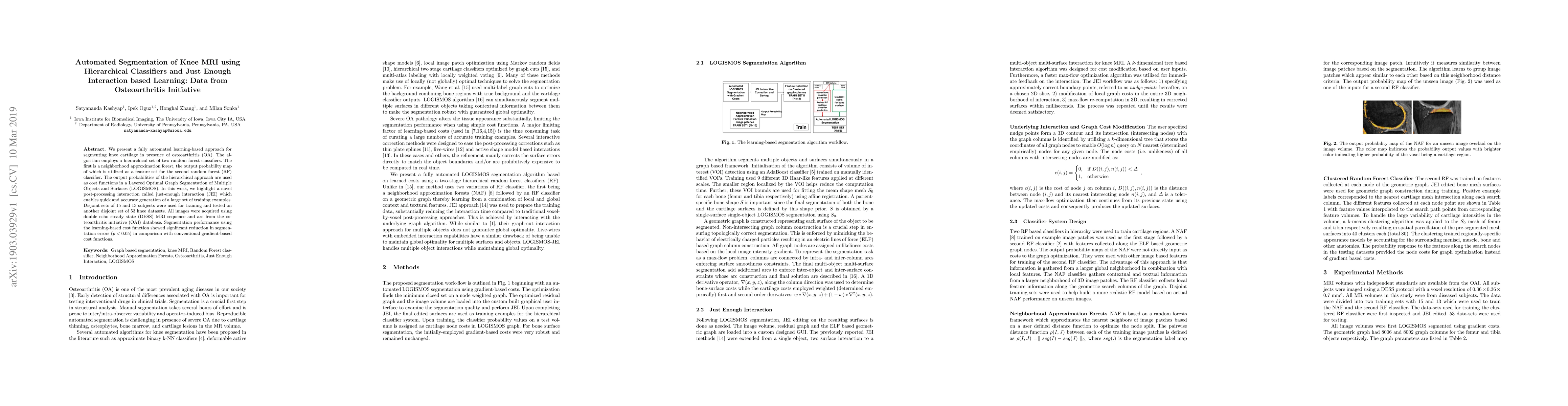 This paper introduces an automated method for segmenting knee cartilage in MRI scans using hierarchical random forest classifiers and a novel just-enough interaction (JEI) post-processing technique. The approach significantly reduces segmentation errors compared to conventional methods, validated on data from the Osteoarthritis Initiative.