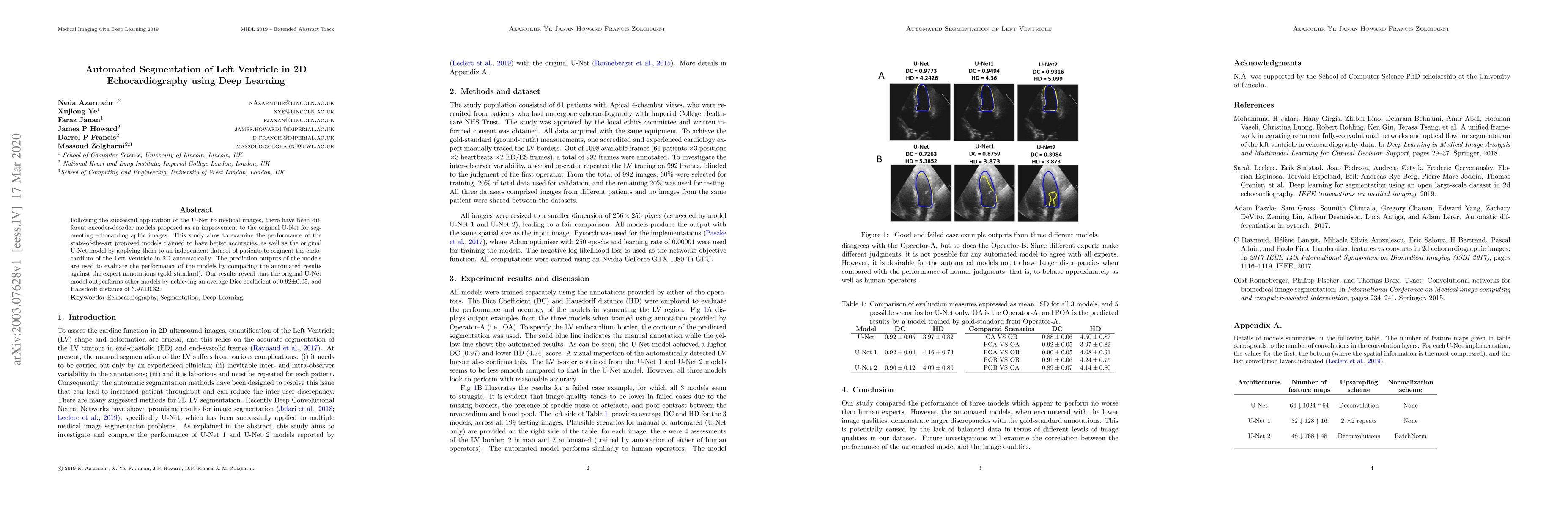 Following the successful application of the U-Net to medical images, there have been different encoder-decoder models proposed as an improvement to the original U-Net for segmenting echocardiographic images. This study aims to examine the performance of the state-of-the-art proposed models as well as the original U-Net model by applying them to segment the endocardium of the Left Ventricle in 2D automatically. The prediction outputs of the models are used to evaluate the performance of the models by comparing the automated results against the expert annotations (gold standard). Our results reveal that the U-Net model outperforms other models by achieving an average Dice coefficient of 0.92$ \pm 0.05$, and Hausdorff distance of 3.97$ \pm 0.82$.