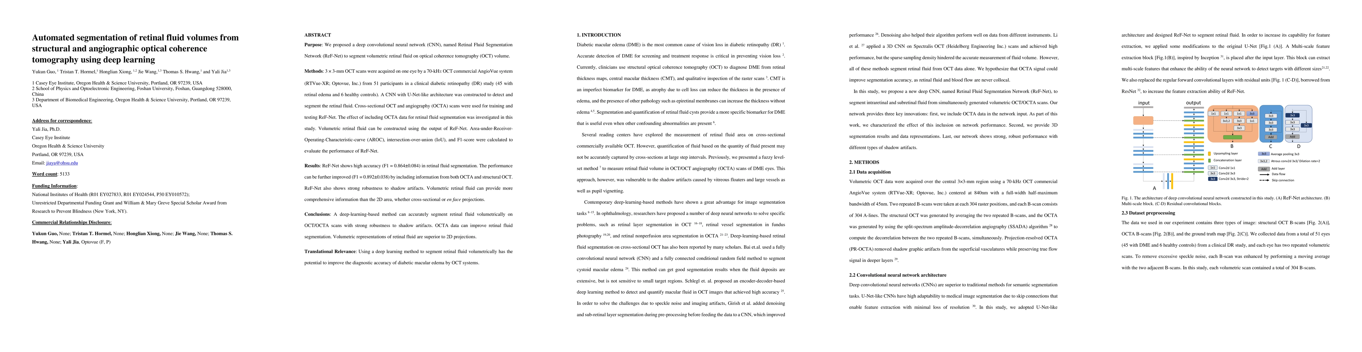 This paper proposes a deep learning model, Retinal Fluid Segmentation Network (ReF-Net), to accurately segment retinal fluid volumes from optical coherence tomography (OCT) and OCT angiography (OCTA) scans. The model shows high accuracy and robustness, with improved performance when using combined OCTA and OCT data, suggesting volumetric retinal fluid analysis provides more comprehensive diagnostic information than 2D projections.
