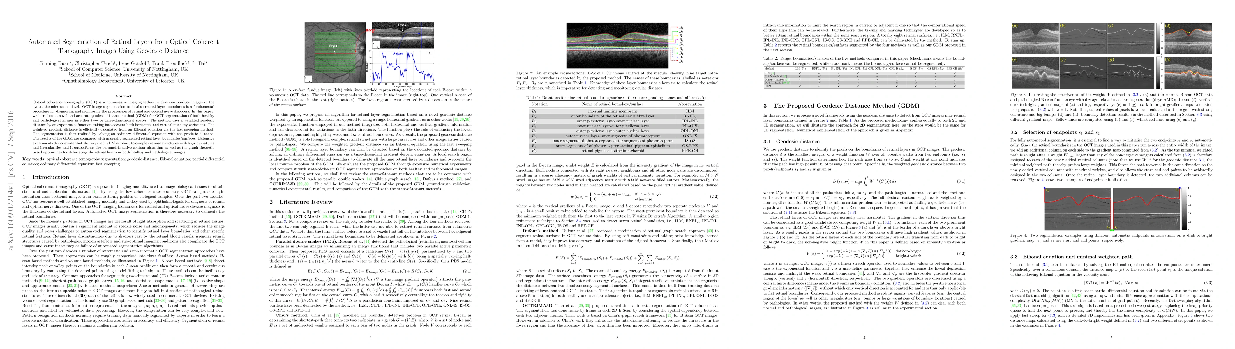 This paper proposes a novel geodesic distance method (GDM) for automated segmentation of retinal layers in OCT images, demonstrating superior performance over existing algorithms in handling complex retinal structures and irregularities. The method efficiently calculates a weighted geodesic distance using the fast sweeping method and solves an ordinary differential equation for segmentation.
