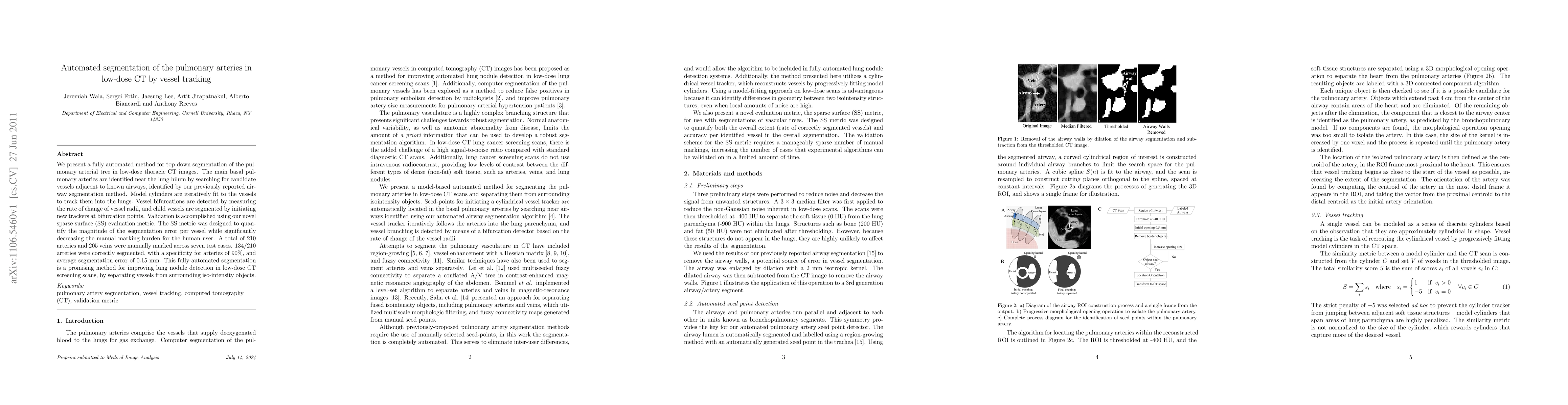 This paper presents a fully automated method for segmenting pulmonary arteries in low-dose CT scans using vessel tracking, achieving high specificity and low segmentation error. The method identifies main arteries near the lung hilum and tracks them using model cylinders, validated with a novel sparse surface metric.
