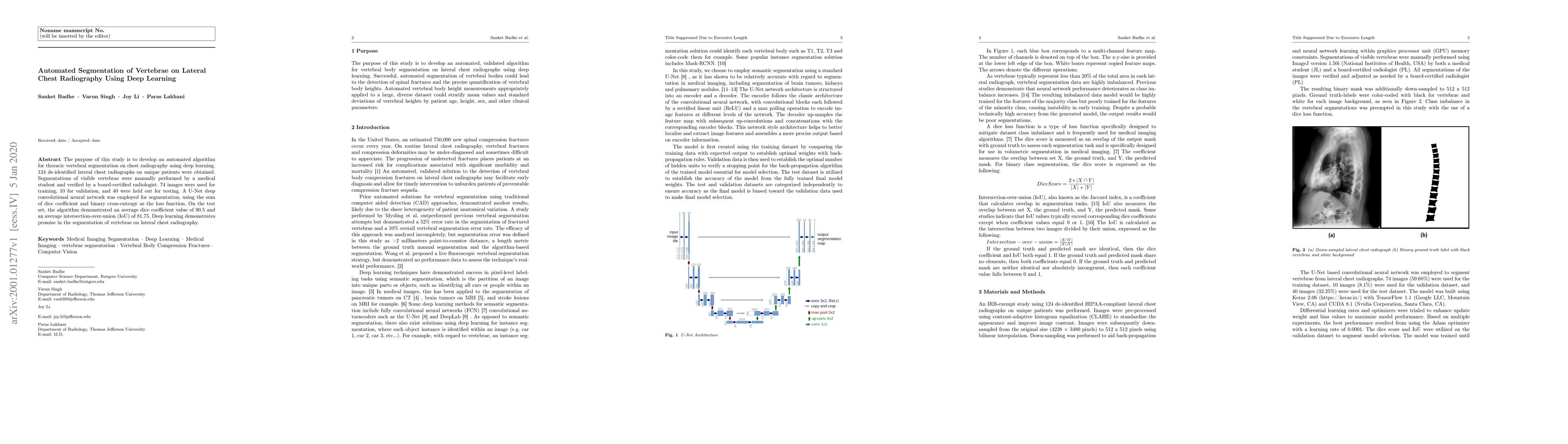 This study developed a deep learning algorithm using a U-Net model to automatically segment vertebrae on lateral chest radiographs, achieving an average dice coefficient of 90.5 and an IoU of 81.75, indicating the potential of deep learning in this medical imaging task.