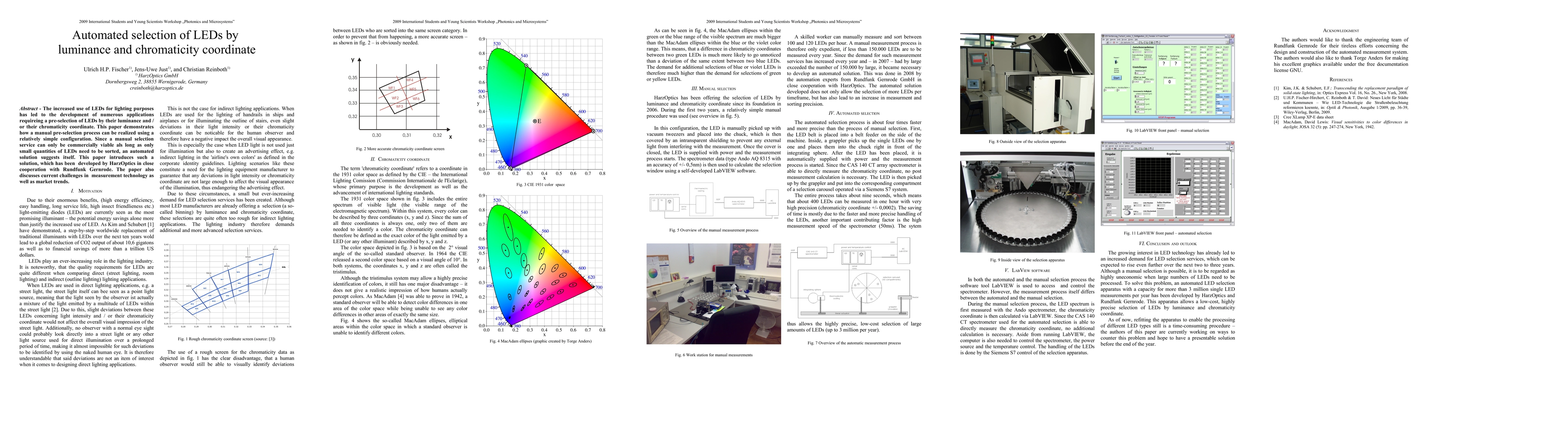 This paper presents an automated system for selecting LEDs based on luminance and chromaticity, developed by Harzoptics and Rundfunk Gernrode to replace manual sorting. It addresses current measurement challenges and market trends in LED lighting applications.
