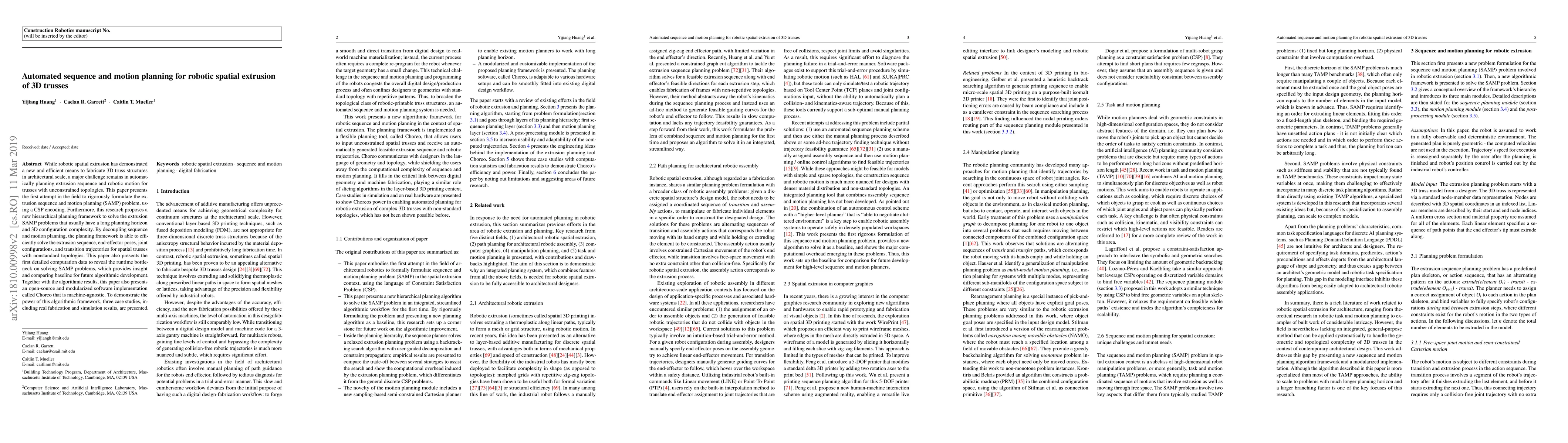 This paper introduces a novel framework for automated sequence and motion planning in robotic spatial extrusion of 3D trusses, addressing the challenge of planning for trusses with unconstrained topologies. The proposed hierarchical planning framework efficiently solves the extrusion sequence and motion planning problems, providing an open-source software implementation called Choreo and demonstrating its effectiveness through real fabrication and simulation case studies.