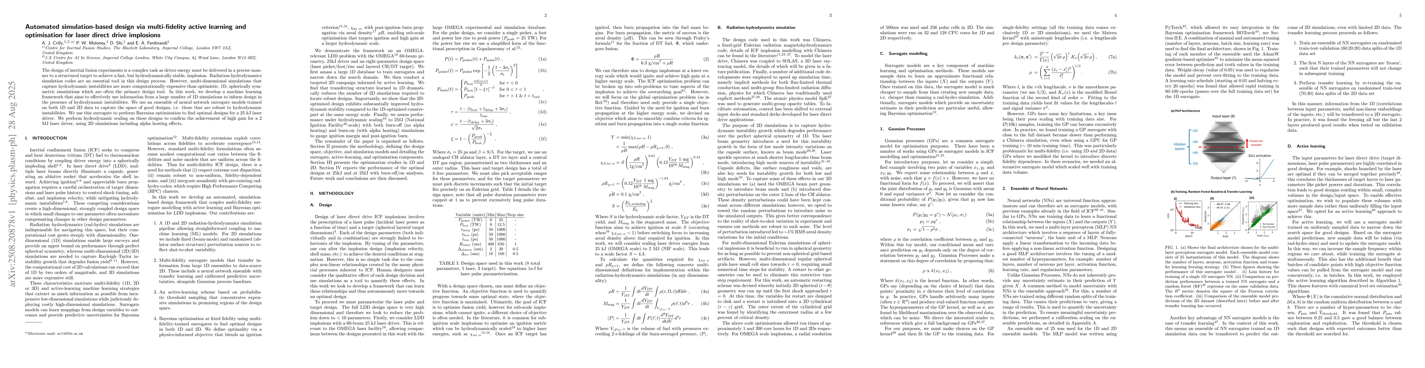 The design of inertial fusion experiments is a complex task as driver energy must be delivered in a precise manner to a structured target to achieve a fast, but hydrodynamically stable, implosion. Radiation-hydrodynamics simulation codes are an essential tool in this design process. However, multi-dimensional simulations that capture hydrodynamic instabilities are more computationally expensive than optimistic, 1D, spherically symmetric simulations which are often the primary design tool. In this work, we develop a machine learning framework that aims to effectively use information from a large number of 1D simulations to inform design in the presence of hydrodynamic instabilities. We use an ensemble of neural network surrogate models trained on both 1D and 2D data to capture the space of good designs, i.e. those that are robust to hydrodynamic instabilities. We use this surrogate to perform Bayesian optimisation to find optimal designs for a 25 kJ laser driver. We perform hydrodynamic scaling on these designs to confirm the achievement of high gain for a 2 MJ laser driver, using 2D simulations including alpha heating effects.